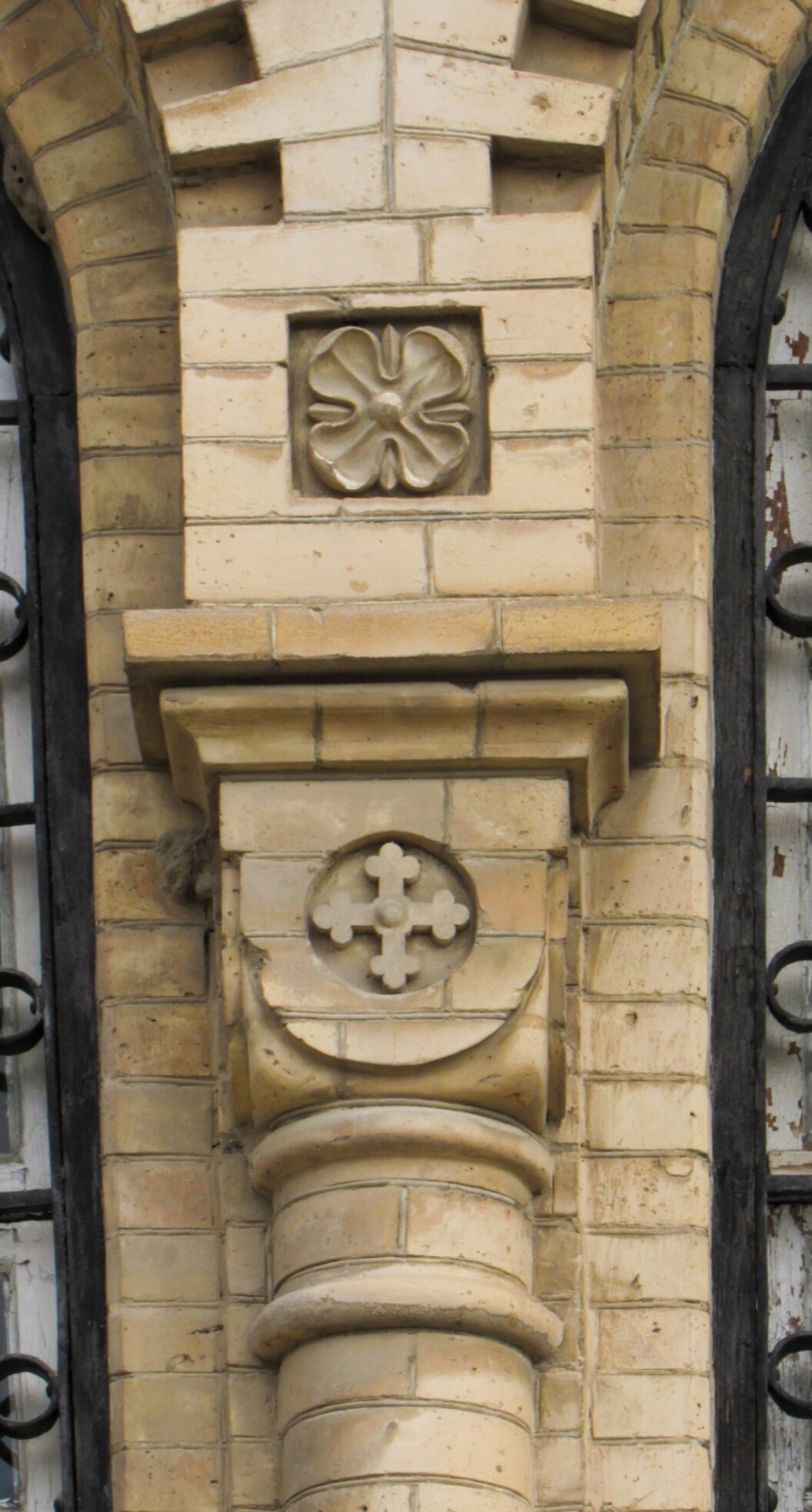 На представленной фотографии запечатлён фрагмент архитектурного убранства Свято-Алексиевского храма в Самарканде — капитель колонны или пилястры, выполненная из тёплого светлого кирпича и украшенная глубоким символическим резным декором. Данный элемент является характерным образцом «кирпичного стиля», распространённого в церковном зодчестве второй половины XIX века.
