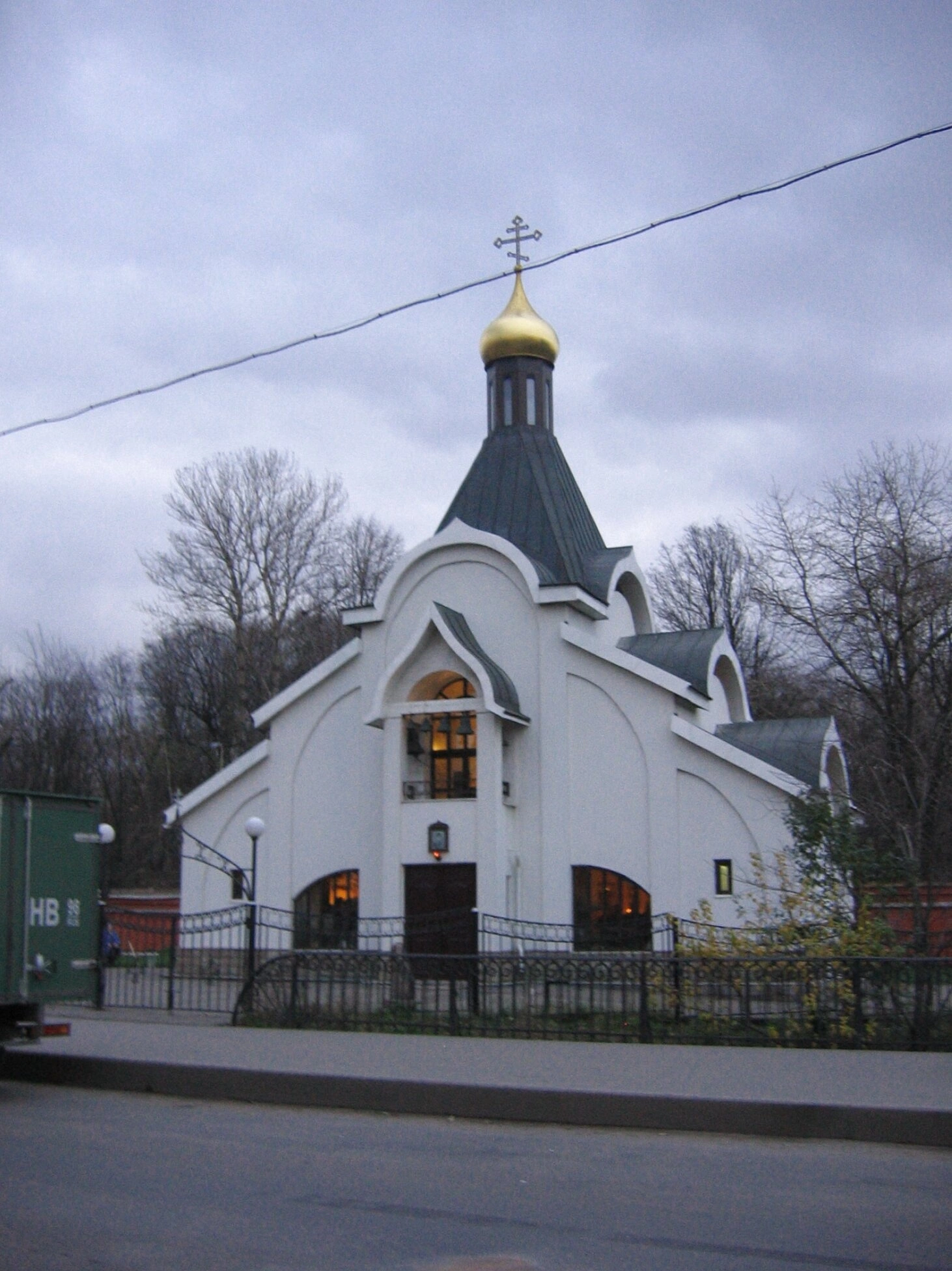 Храмовая территория ограждена металлической оградой, что подчёркивает сакральность пространства. На фотографии запечатлён осенне-зимний период, о чём свидетельствуют деревья без листвы на заднем плане. Небо покрыто облаками, что создаёт особое настроение уединённости и сосредоточенности. На переднем плане заметен хозяйственный контейнер зелёного цвета, что указывает на бытовую сторону функционирования церковного комплекса.
