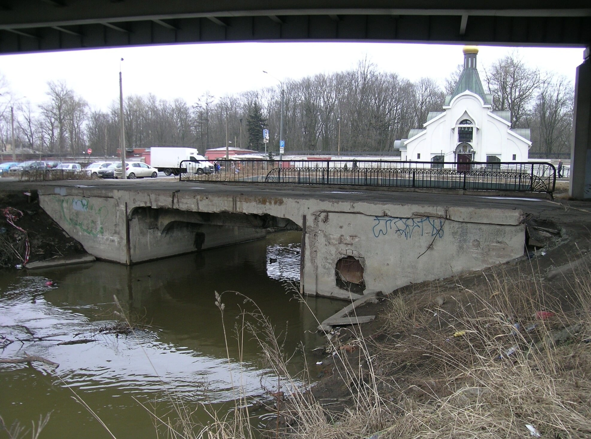 Особенностью данного ракурса является то, что фотография сделана под эстакадой или крупным мостом, фрагмент конструкции которого виден в верхней части кадра. Это создает своеобразную архитектурную рамку, обрамляющую вид на святыню. Казанская церковь на Красненьком кладбище является действующим православным храмом, несущим утешение и молитвенную поддержку верующим в месте вечного упокоения.