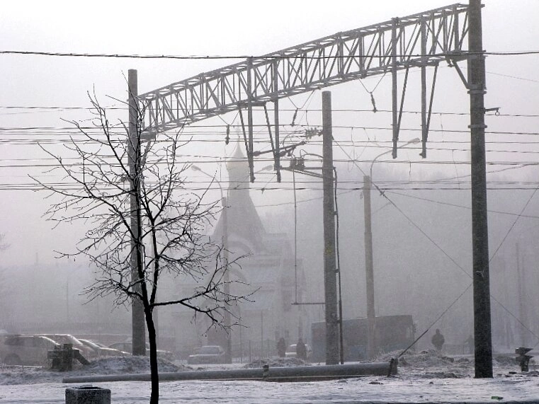 Передний план фотографии занимает одинокое дерево с обнаженными от листвы ветвями, что усиливает ощущение зимнего покоя и временного остановившегося бытия. Присутствие железнодорожной инфраструктуры с опорами контактной сети напоминает о близости мирской суеты, контрастирующей с вечным покоем обители усопших.