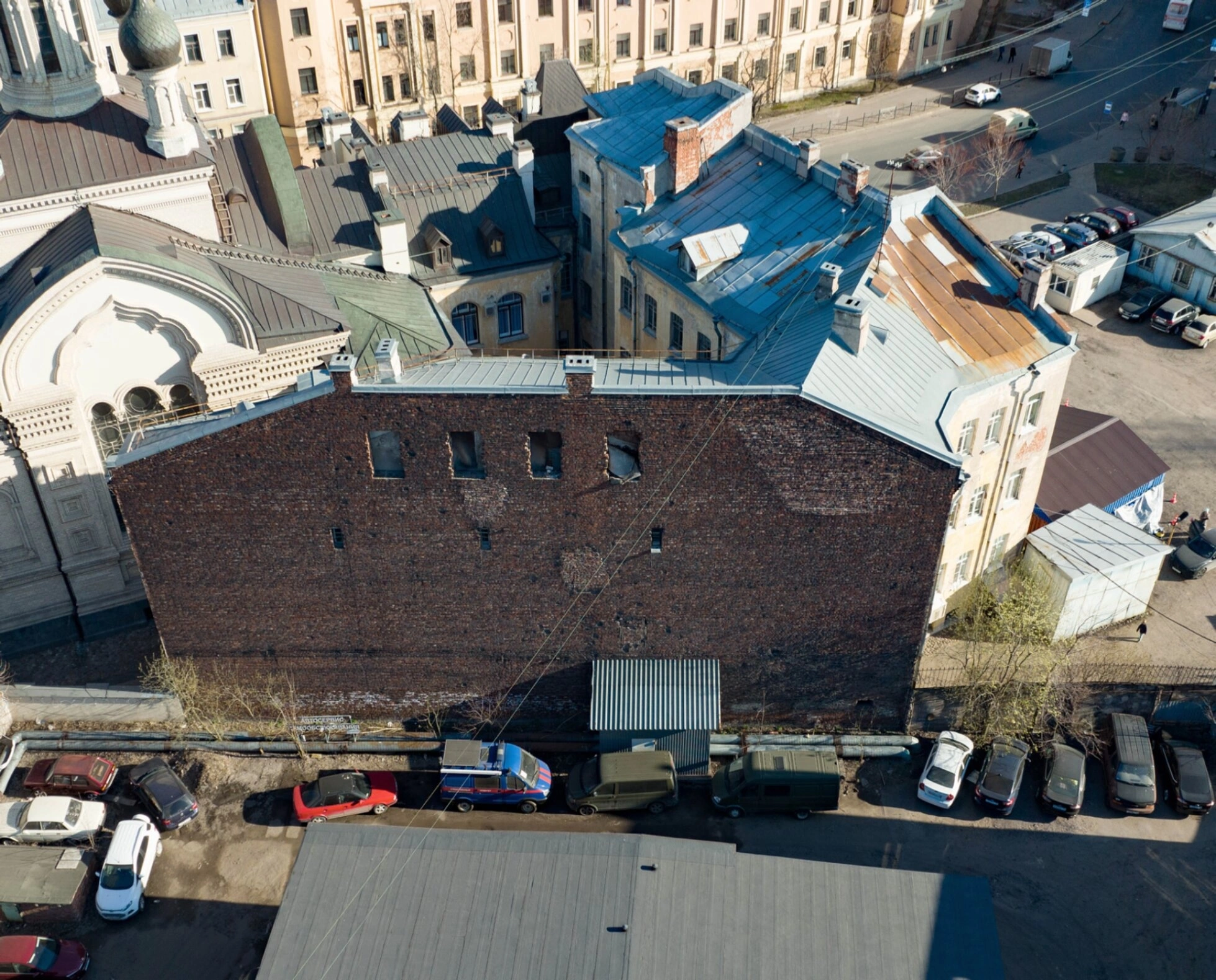 На представленной фотографии запечатлён комплекс подворья Валаамского монастыря в Санкт-Петербурге, вид с высоты птичьего полёта. В кадре доминирует большое здание из тёмного кирпича с несколькими оконными проёмами и крышей, покрытой металлическими листами. Слева видна часть более светлого строения с купольным завершением, справа — другие исторические постройки со скатными крышами. На территории видны припаркованные автомобили, что свидетельствует о современном использовании подворья. Общий план передаёт плотную городскую застройку исторического района.