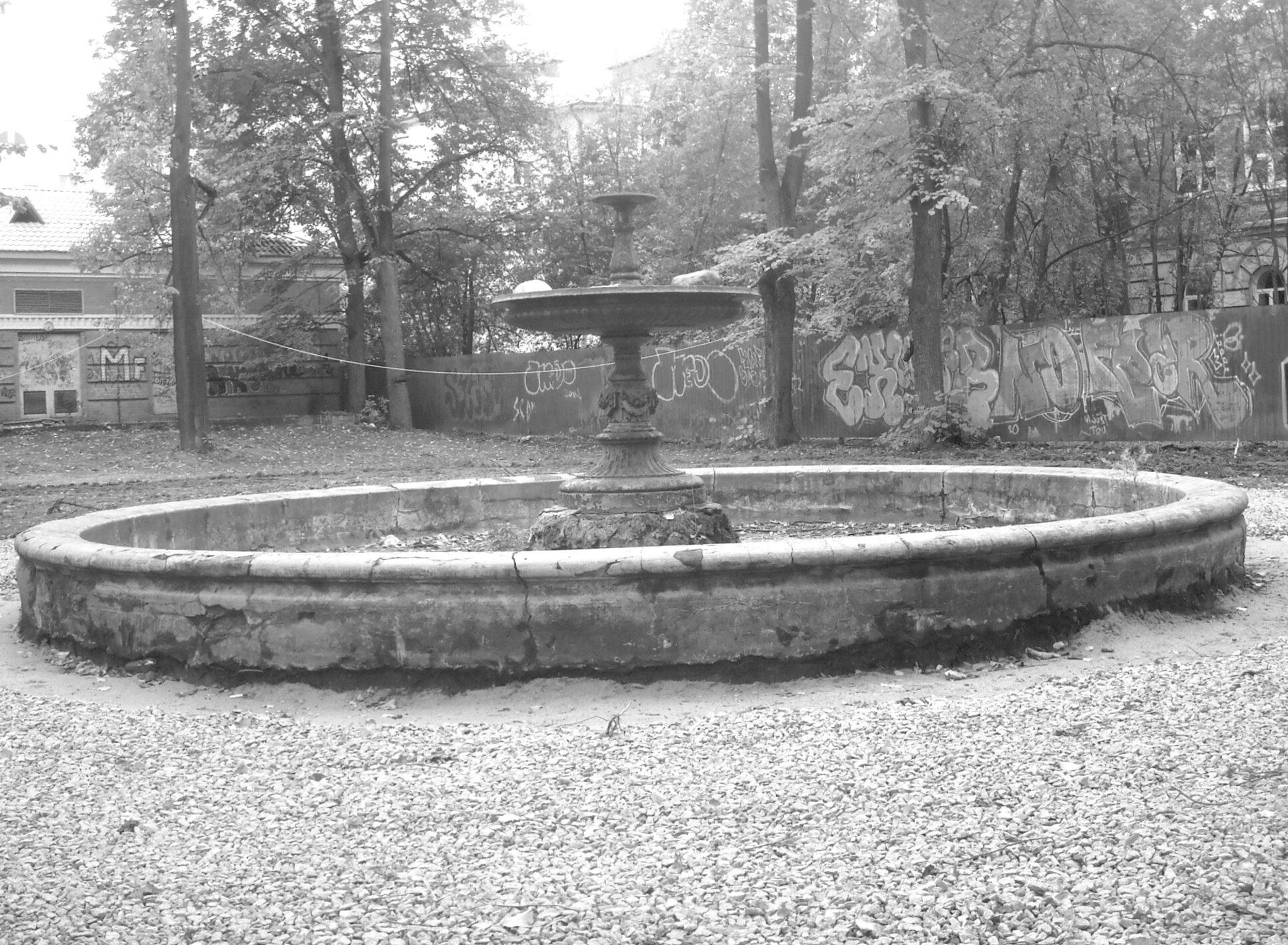 Прилегающая территория храма предстает в запустении: земля покрыта гравием и опавшей листвой, что указывает на отсутствие должного ухода в период создания фотографии. Деревья без листвы на заднем плане дополняют атмосферу осеннего или ранневесеннего уныния.