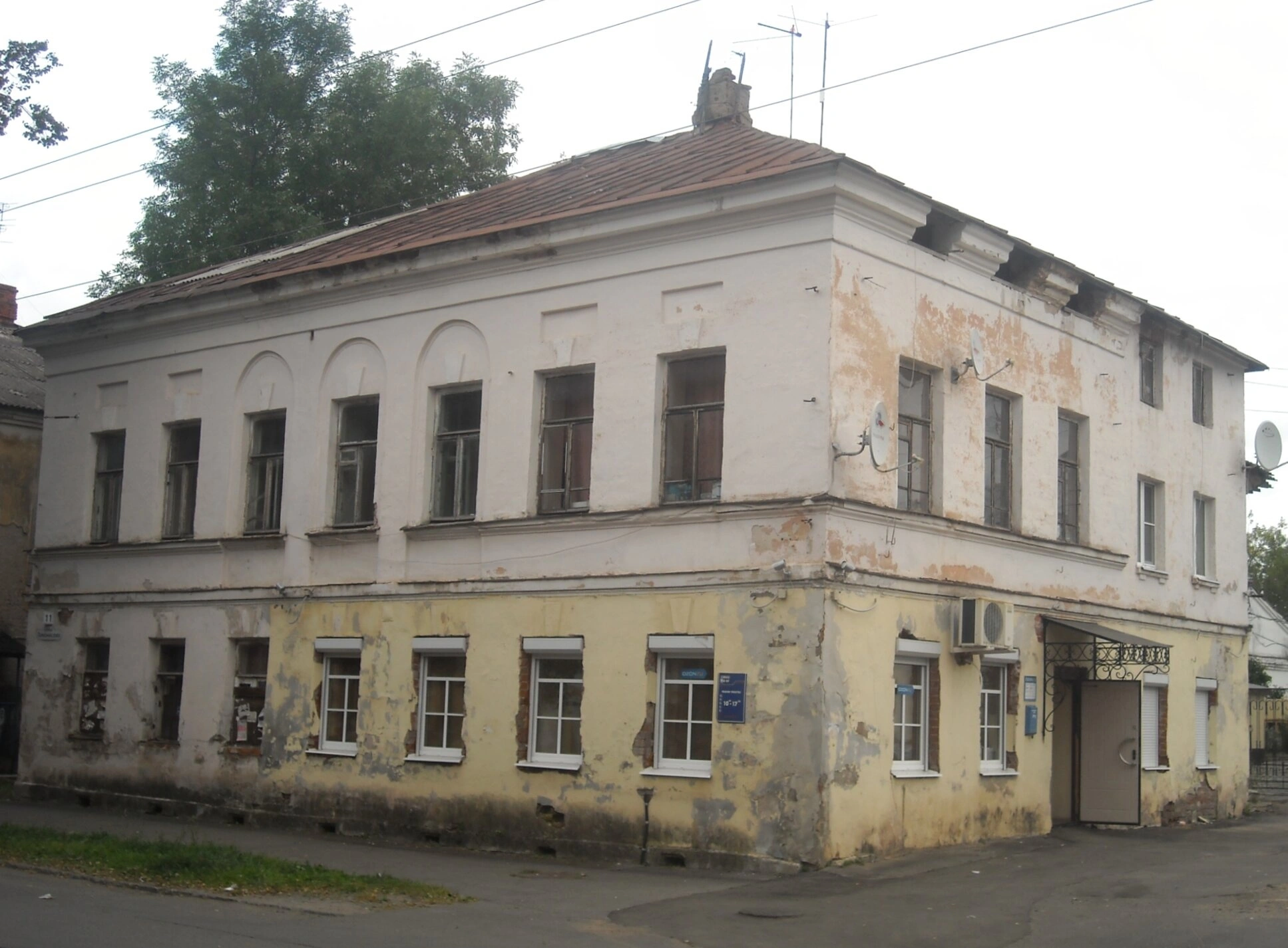 На представленной фотографии запечатлена Казанская церковь, расположенная в городе Рыбинске Ярославской области. Храм представляет собой двухэтажное каменное здание, выполненное в традициях русской церковной архитектуры. Фасад здания демонстрирует следы времени: штукатурка местами отслоилась, обнажая добротную кирпичную кладку, что свидетельствует о почтенном возрасте сооружения.
