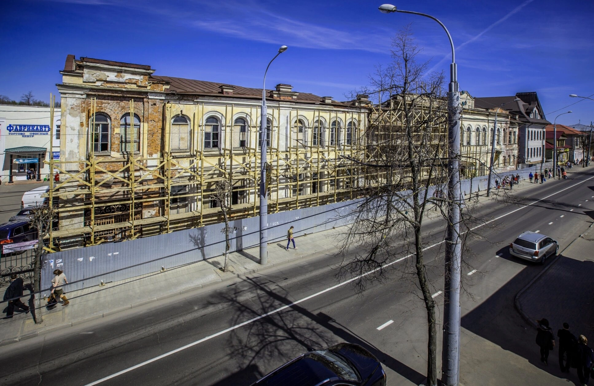 На представленной фотографии запечатлена Казанская церковь в городе Рыбинске Ярославской области, находящаяся в процессе реставрационных работ. Храм, расположенный на улице Крестовой, демонстрирует бережное сохранение архитектурного наследия православной культуры.