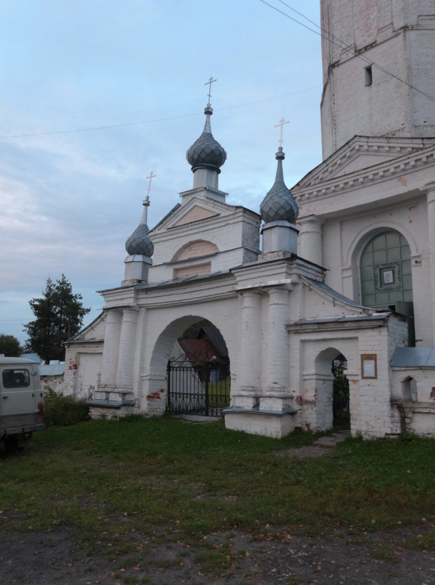 Интерьер храма, частично показанный на фотографии, отражает традиционное православное убранство, создающее благоговейную атмосферу для молитвенного предстояния. Архитектурный облик церкви гармонично сочетается с окружающим природным ландшафтом, образуя единый духовно-культурный комплекс, сохраняющий историческую память и православные традиции русского севера.