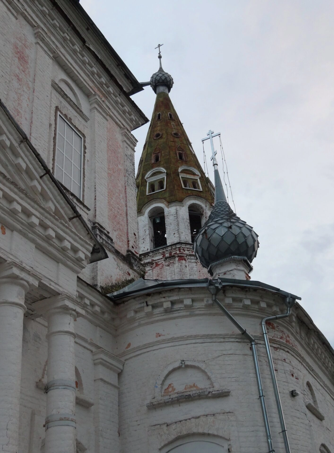 Состояние храма на момент фотографирования показывает следы времени: на белых стенах заметны участки осыпавшейся штукатурки, на поверхности колокольни просматриваются следы патины. При этом наличие современных водосточных систем указывает на проводимые работы по сохранению архитектурного памятника.
