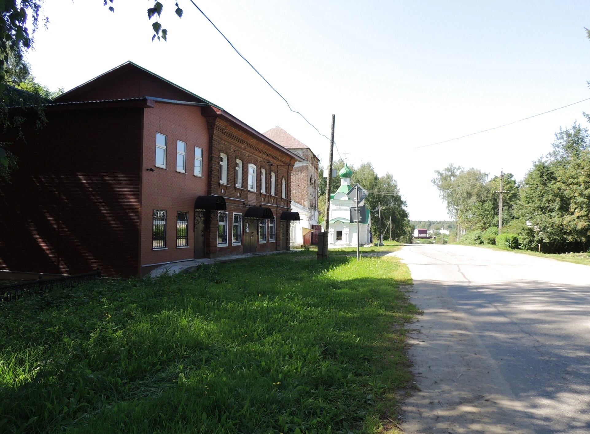 Перед зданиями простирается участок с высокой зелёной травой, а справа от него проходит асфальтированная дорога. Вдоль дороги протянулись электрические провода и столбы. Задний план фотографии заполнен деревьями и кустарниками, над которыми раскинулось чистое голубое небо с лёгкими облаками. Тени от деревьев падают на левую часть кадра, добавляя снимку глубины и естественности.