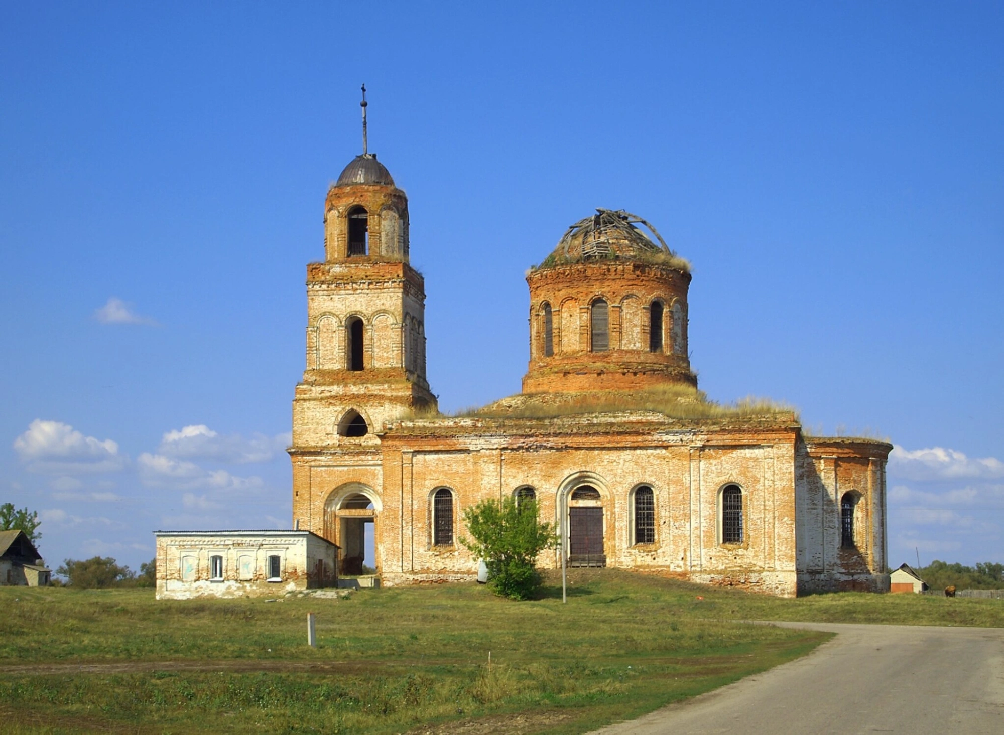 На снимке здание предстаёт в своём архитектурном величии, хотя и в повреждённом состоянии. Храм представляет собой кирпичное сооружение с двухсветным четвериком, увенчанным большим куполом. К основному объёму примыкает трапезная и высокая колокольня, завершающаяся шатром с небольшим куполом. Архитектура здания отражает стилистику эклектики с элементами русского стиля. В момент съёмки 11 сентября 2017 года церковь пребывала в заброшенном состоянии: кирпичная кладка обветшала, купол и кровля частично разрушены, на стенах и крыше заметны следы прорастающей растительности. Справа от храма проходит грунтовая дорога, а на заднем плане виднеются редкие деревья и скромные сельские постройки. Снимок сделан в ясный день под голубым небом с редкими облаками.