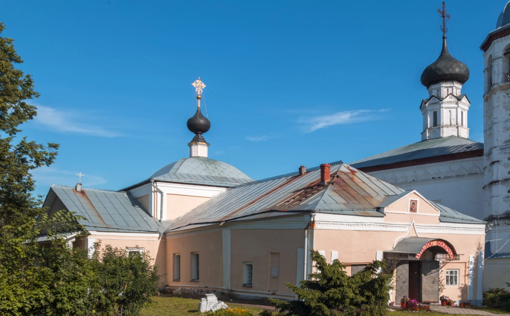 С правой стороны кадра видна часть высокой белой колокольни с черным куполом, характерная для архитектурного ансамбля суздальских храмов. Колокольня традиционно выполняет важную роль в церковной жизни, созывая верующих на богослужения.