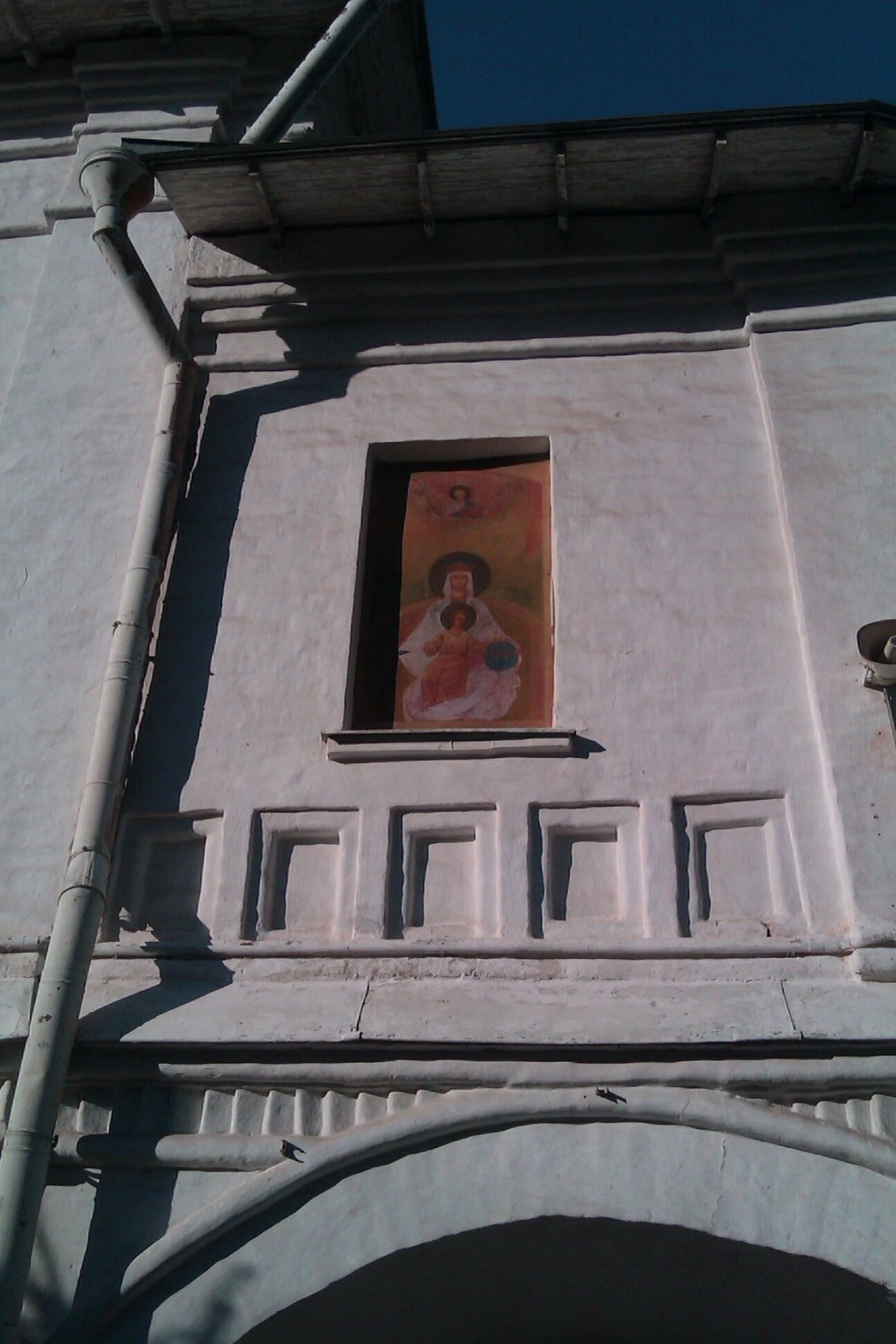 Яркий солнечный свет, падающий на стену, живо выявляет объём и рельефность кладки, углубляя тени от архитектурных деталей и трубы. Такая игра света и тени подчёркивает материальность храмового строения, созданного человеческими руками, и одновременно освещает невещественный свет священного образа, напоминая о его небесном заступничестве. Снимок сделан снизу вверх, что зрительно усиливает монументальность и величие церковной стены, устремляющейся ввысь. В правом верхнем углу фотографии виден небольшой отрезок синего небесного свода.
