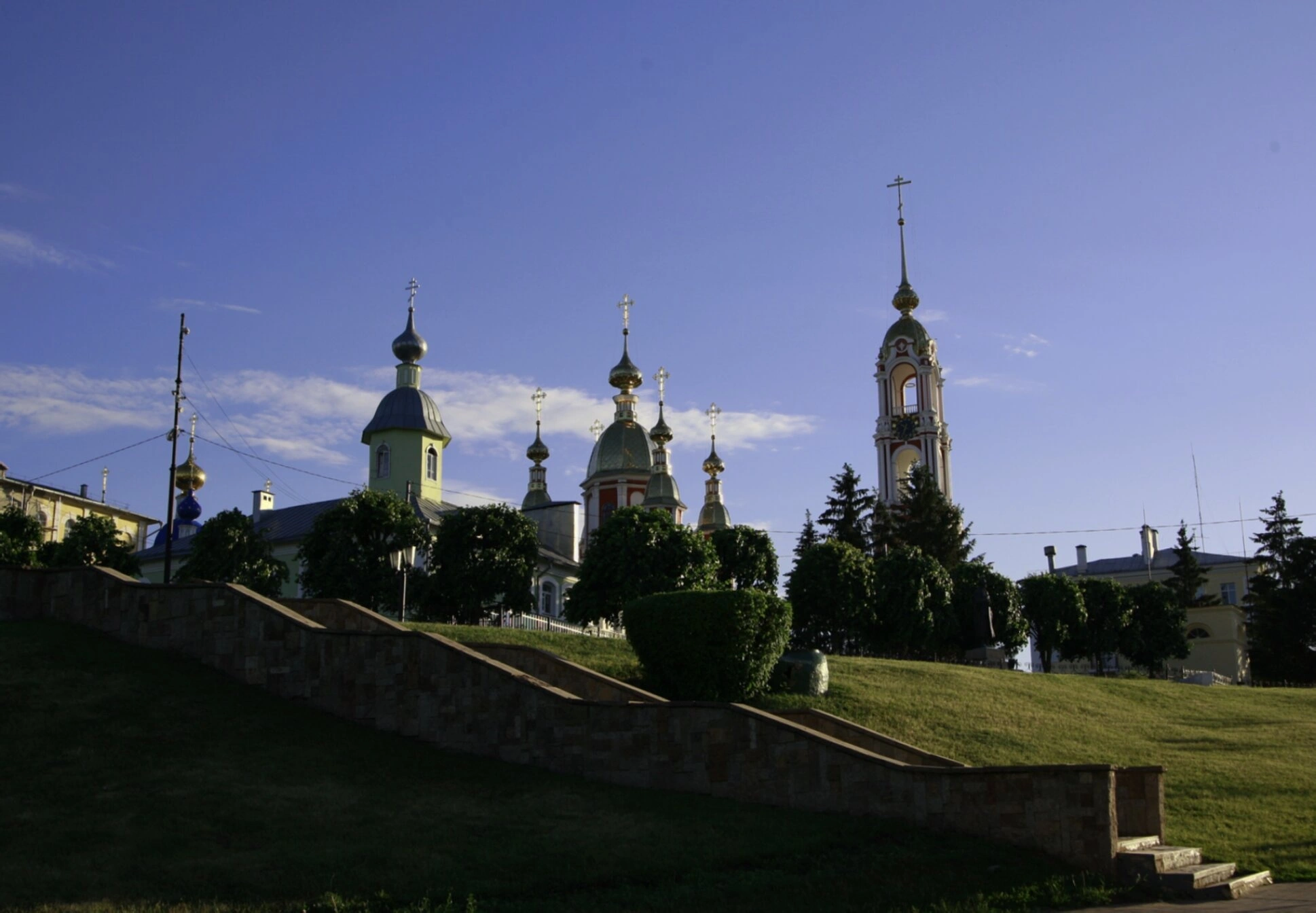 На представленной фотографии запечатлён Казанский Богородичный мужской монастырь, древняя православная обитель, расположенная в городе Тамбове. Снимок позволяет созерцать монастырский комплекс, возвышающийся на берегу реки Цны, в ясный день под безоблачным голубым небом. Ракурс, выбранный фотографом, раскрывает величие архитектурного ансамбля, сложившегося в конце XVIII – начале XIX веков и выполненного в благородных традициях русского классицизма.
