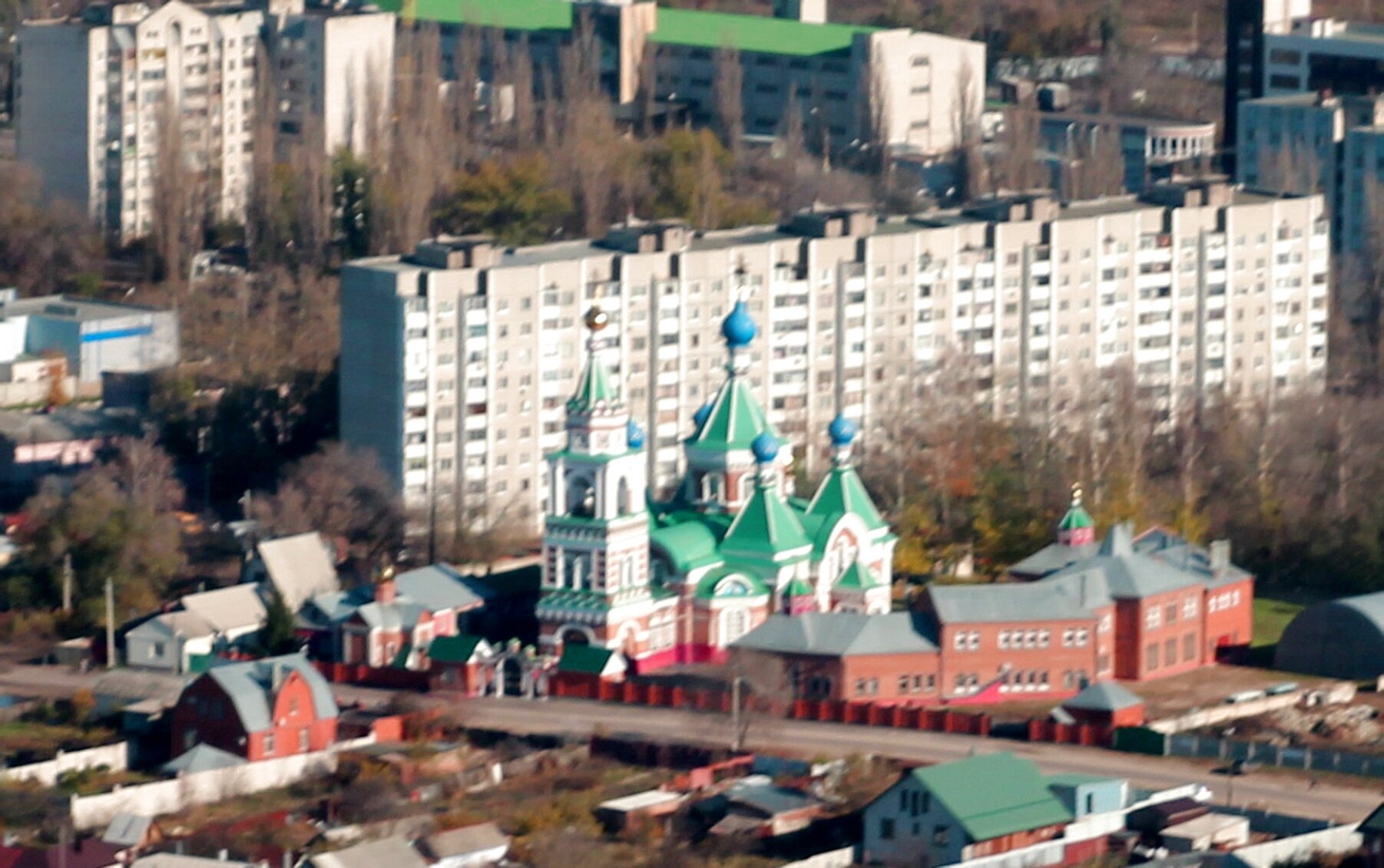 На снимке зафиксирован внебогослужебный момент, что позволяет рассмотреть архитектурные детали в спокойной обстановке. Деревья вокруг храма находятся без листвы, что позволяет предположить, что фотография сделана в позднеосенний или ранневесенний период. Храм гармонично сочетается с окружающей малоэтажной застройкой, а на заднем плане виднеются современные жилые дома, что подчёркивает неразрывную связь духовной традиции и современной жизни города.