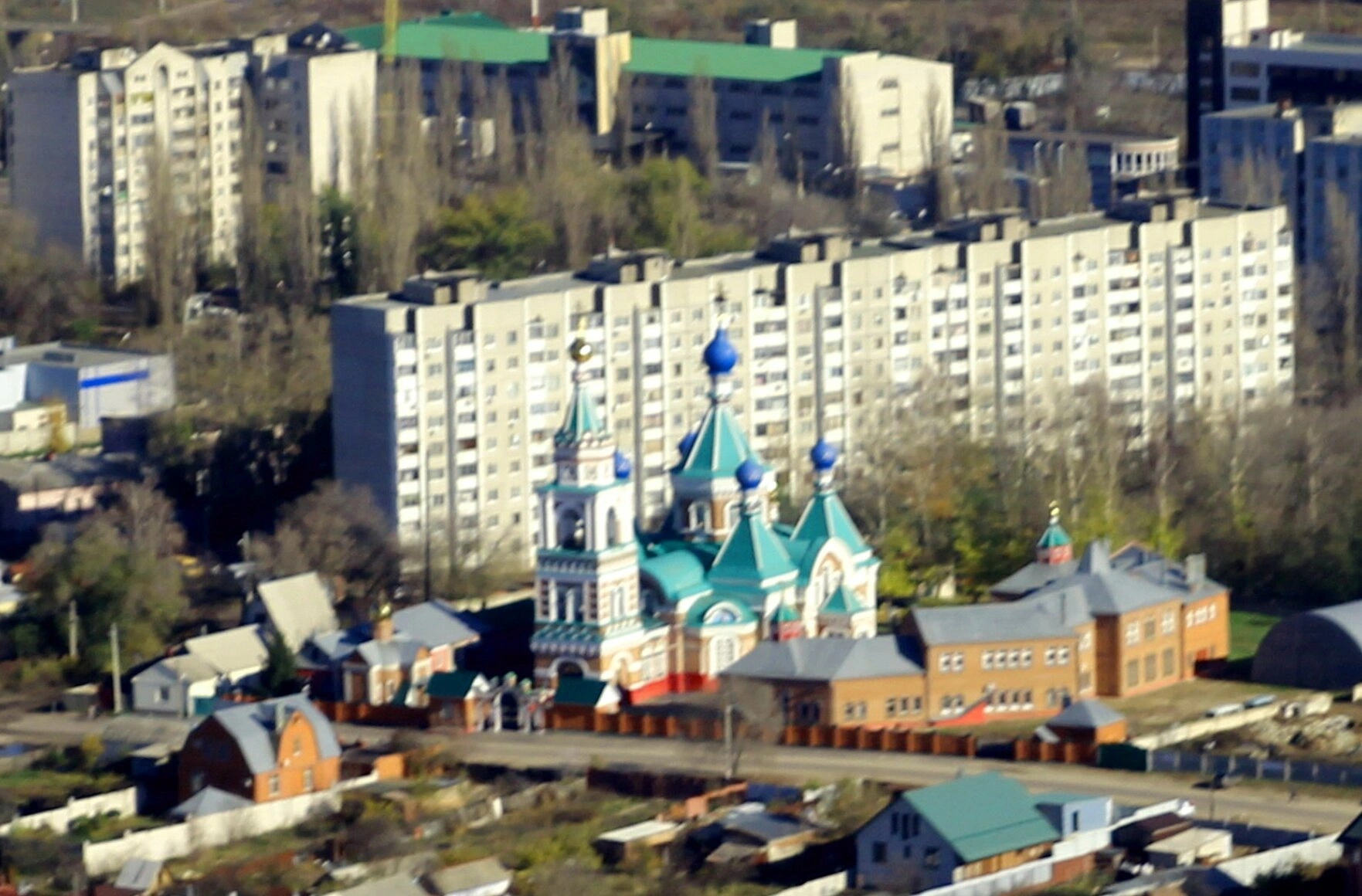 На представленной фотографии запечатлён величественный ансамбль Казанского храма города Воронежа, снятый с высоты птичьего полёта. Центральное место в композиции занимает сам православный собор, освящённый в честь Казанской иконы Божией Матери. Храм поражает своим благолепием: его нарядные зелёные кровли и синие главы, увенчанные золочёными звёздами, ярко выделяются на фоне городской застройки, символизируя небесную чистоту и надежду.