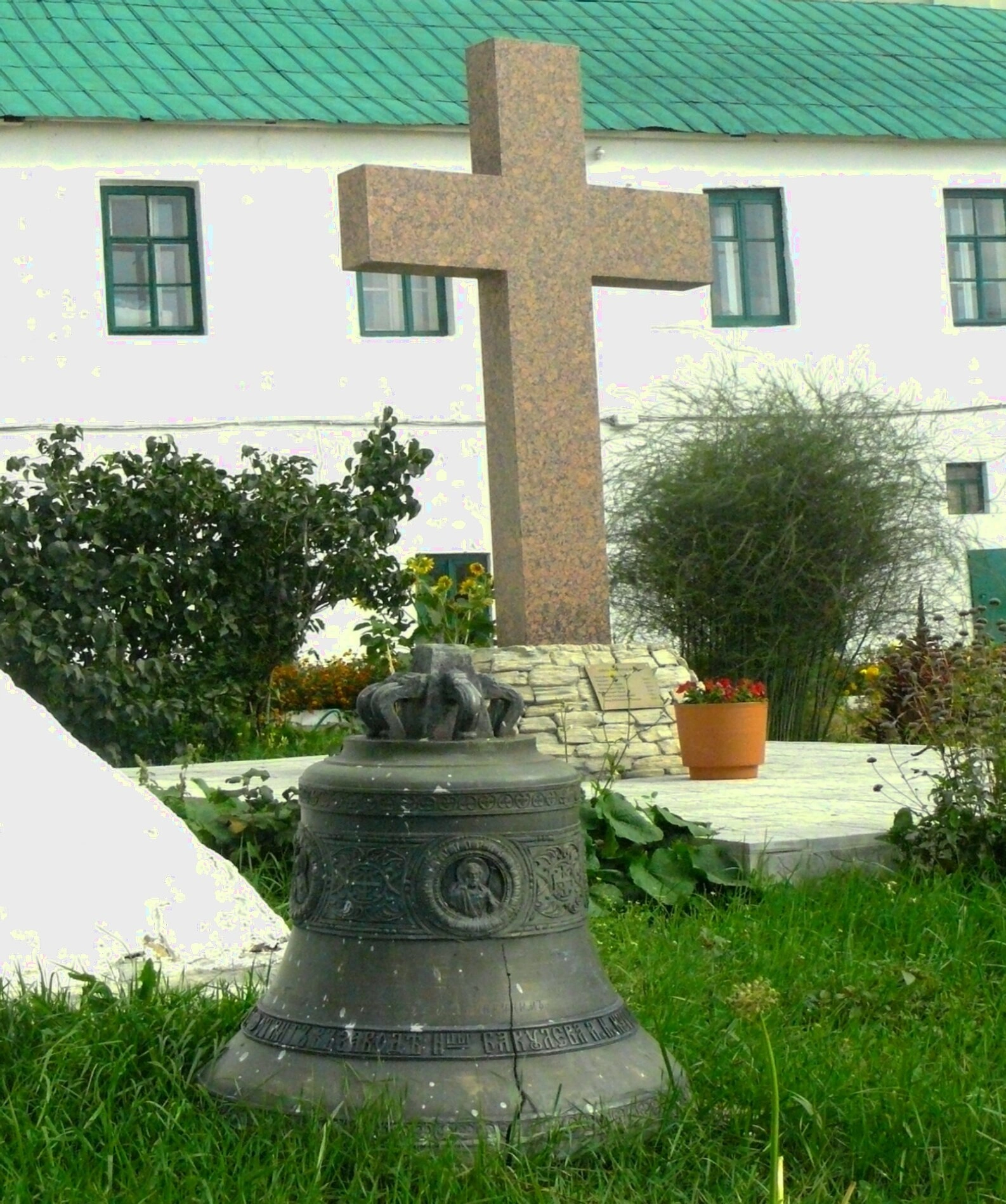 На фотографии запечатлён архитектурный ансамбль Казанского Иоанно-Предтеченского мужского монастыря. На переднем плане возвышается монументальная каменная колокольня, являющаяся одной из архитектурных доминант обители. Рядом с ней установлен большой поклонный крест, выполненный из камня, который является символом спасения и искупительной жертвы Христовой.