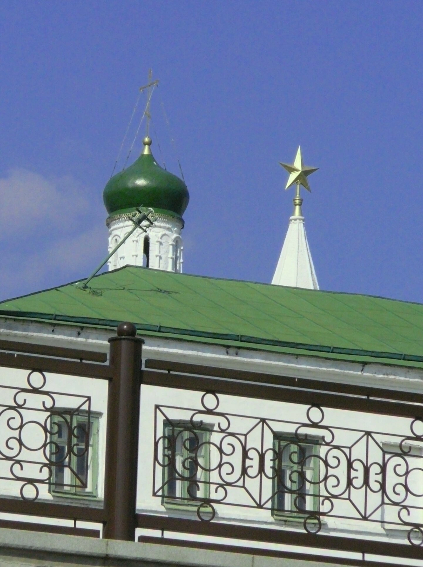 Особое внимание приковывает золочёная главка одного из храмов монастырского подворья, увенчанная православным крестом, который символизирует искупительную жертву Христа. Рядом виден стройный светлый шатёр, завершающийся сияющей золотой звездой. Это знаменитая Спасская башня Казанского Кремля, являющаяся не только крепостным сооружением, но и часовней, освящённой в честь Нерукотворного Образа Спасителя.