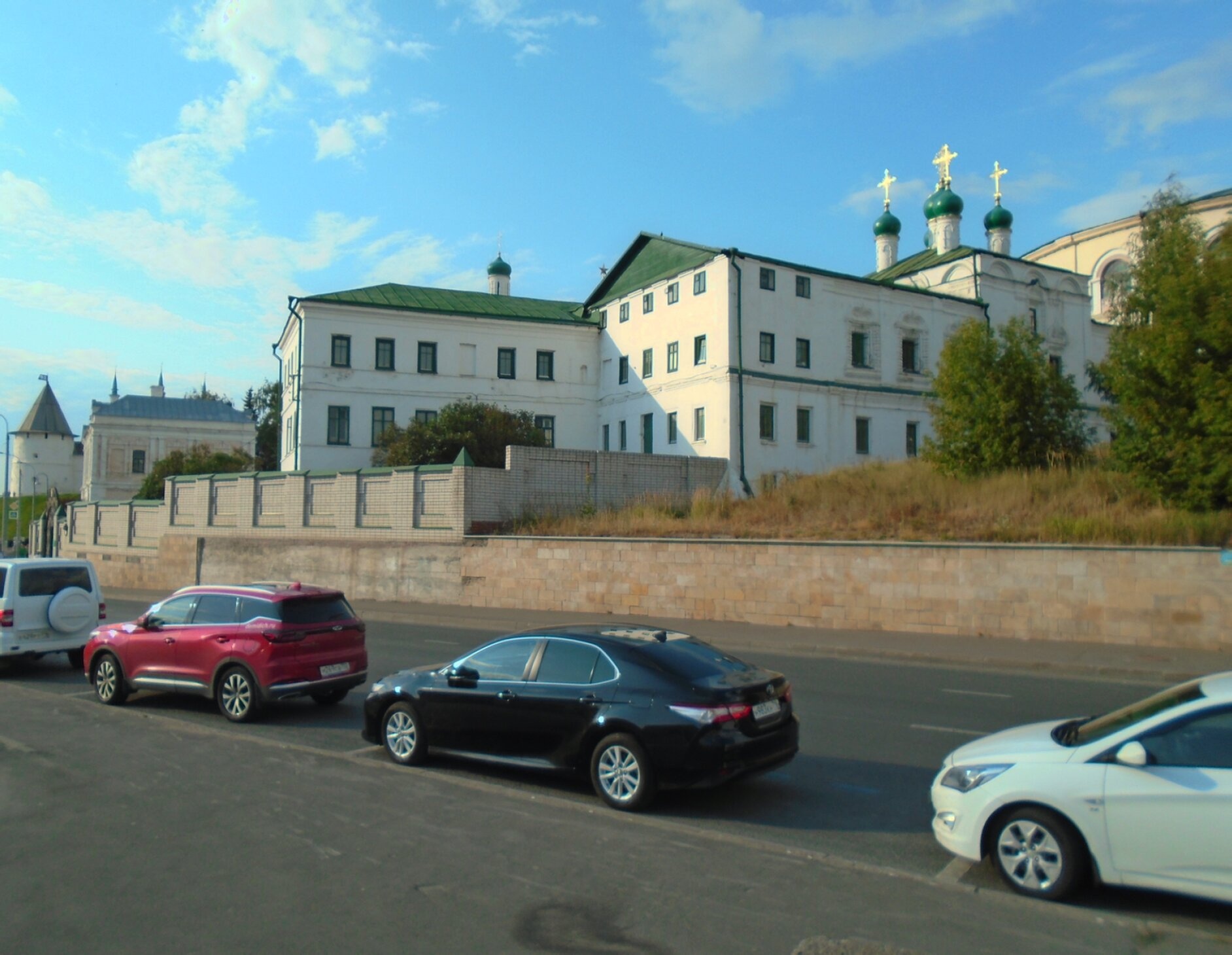 На представленной фотографии запечатлён вид на святую обитель — Казанский Иоанно-Предтеченский монастырь, один из значимых духовных центров города Казани. Снимок сделан с улицы, что позволяет оценить монастырский комплекс в его гармонии с городским пространством.