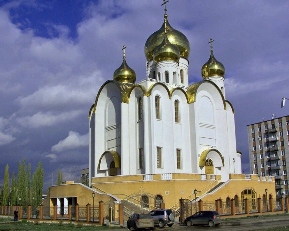 На фотографии запечатлён Казанский кафедральный собор, являющийся кафедральным собором Альметьевской епархии Татарстанской митрополии Русской Православной Церкви. Величественный белокаменный храм, увенчанный золочёными куполами, возвышается на Соборной площади города Альметьевска, символизируя духовное возрождение края.