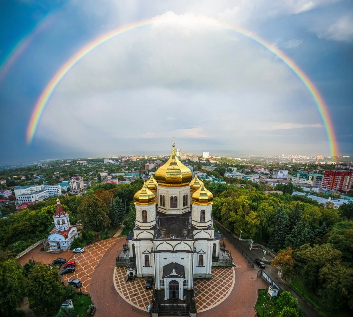 На представленной фотографии запечатлён воссозданный Казанский кафедральный собор, кафедральный храм Ставропольской епархии, в момент поистине Божьего знамения — под сенью радуги. Величественный пятикупольный храм, увенчанный золотыми главами, возвышается на историческом месте — на Крепостной горе, откуда берёт начало город Ставрополь. Его белоснежные стены и строгий русско-византийский архитектурный облик символизируют собой духовное возрождение и непрерывность православной традиции на Кавказе.