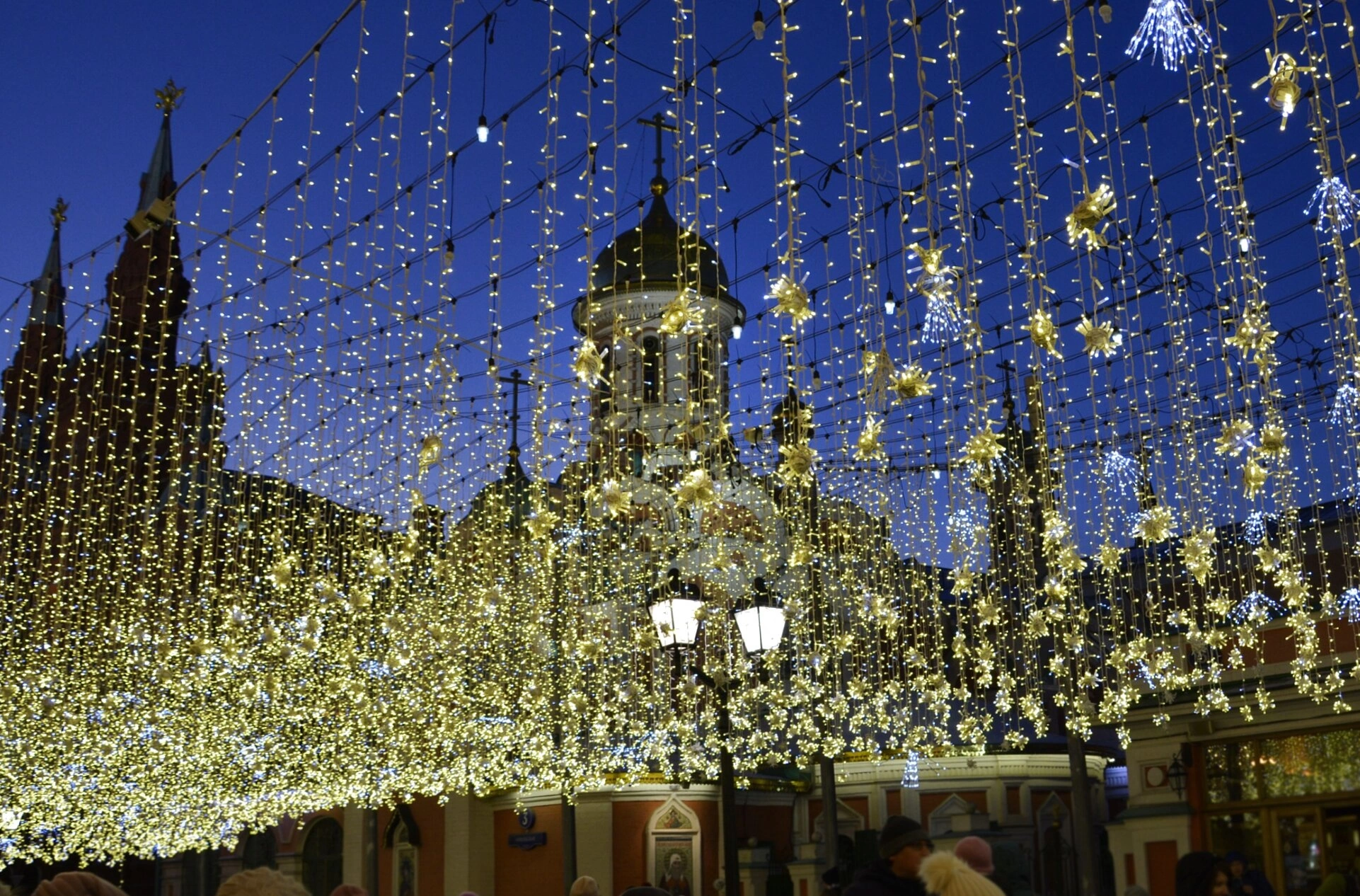 Снимок сделан в тёмное время суток, когда тёплый свет многочисленных гирлянд контрастирует с глубоким синим небом. Золочёные купола и нарядные фасады храма, освещённые мягким светом, выделяются на фоне монументальной Кремлёвской стены и башен, виднеющихся слева. Праздничное убранство, состоящее из гирлянд с декоративными элементами, создаёт ощущение торжества и благоговейной тишины, свойственное преддверию великих церковных праздников.