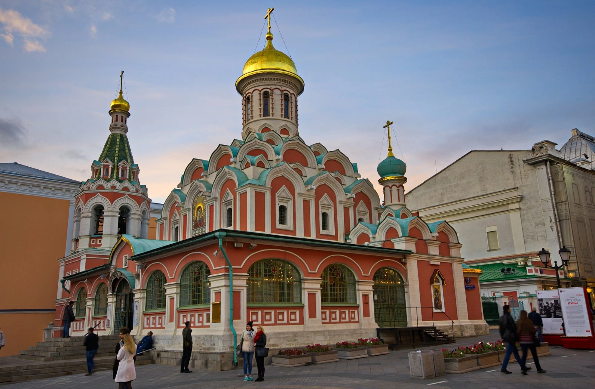 На представленной фотографии запечатлён Казанский собор, расположенный на Красной площади в Москве. Этот православный храм, освящённый в честь Казанской иконы Божией Матери, является одним из символов духовного возрождения России. Снимок позволяет рассмотреть величественную архитектуру собора, выполненную в русском стиле, а также окружающую его городскую среду.