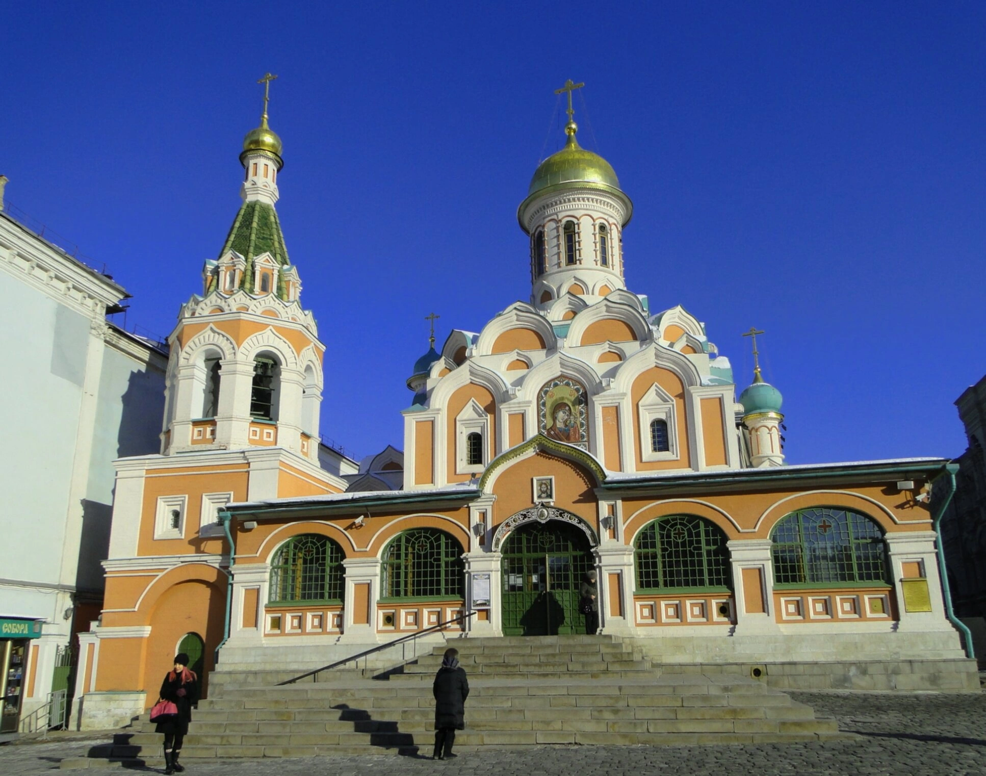 Представленная фотография запечатлела Казанский собор, расположенный на углу Красной площади и Никольской улицы в Москве. Святыня, освящённая в честь Казанской иконы Божией Матери, занимает особое место в духовной жизни православных христиан и историческом облике столицы.