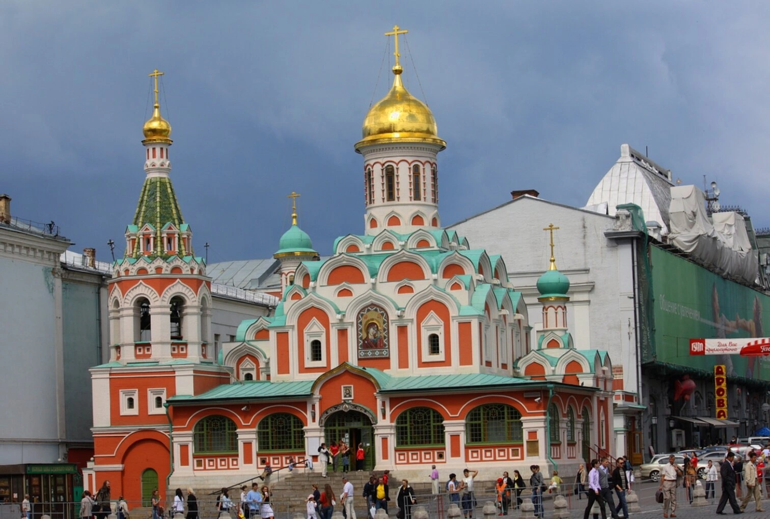 На представленной фотографии запечатлён Казанский кафедральный собор, что находится в сердце российской столицы — на Красной площади. Этот святой храм, освящённый в честь Казанской иконы Божией Матери, является не только памятником архитектуры, но и живым символом русского православия, местом молитвы и паломничества для верующих со всего мира.
