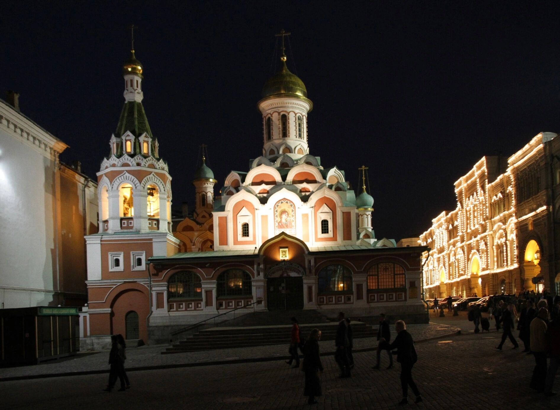 Торжественное освещение храма, являющегося памятником русской воинской славы и народного почитания чудотворного образа, контрастирует с тёплым, обильным светом от исторического здания Государственного универсального магазина (ГУМ), видного справа. Брусчатка площади, по которой в отдалении прогуливаются люди, отражает свет, добавляя снимку глубины и оживлённости. Эта фотография передаёт не просто ночной вид, а атмосферу благоговейного покоя и непрерывной молитвенной жизни у одной из главных святынь столицы, бережно восстановленной в 1993 году на месте исторического храма XVII века.