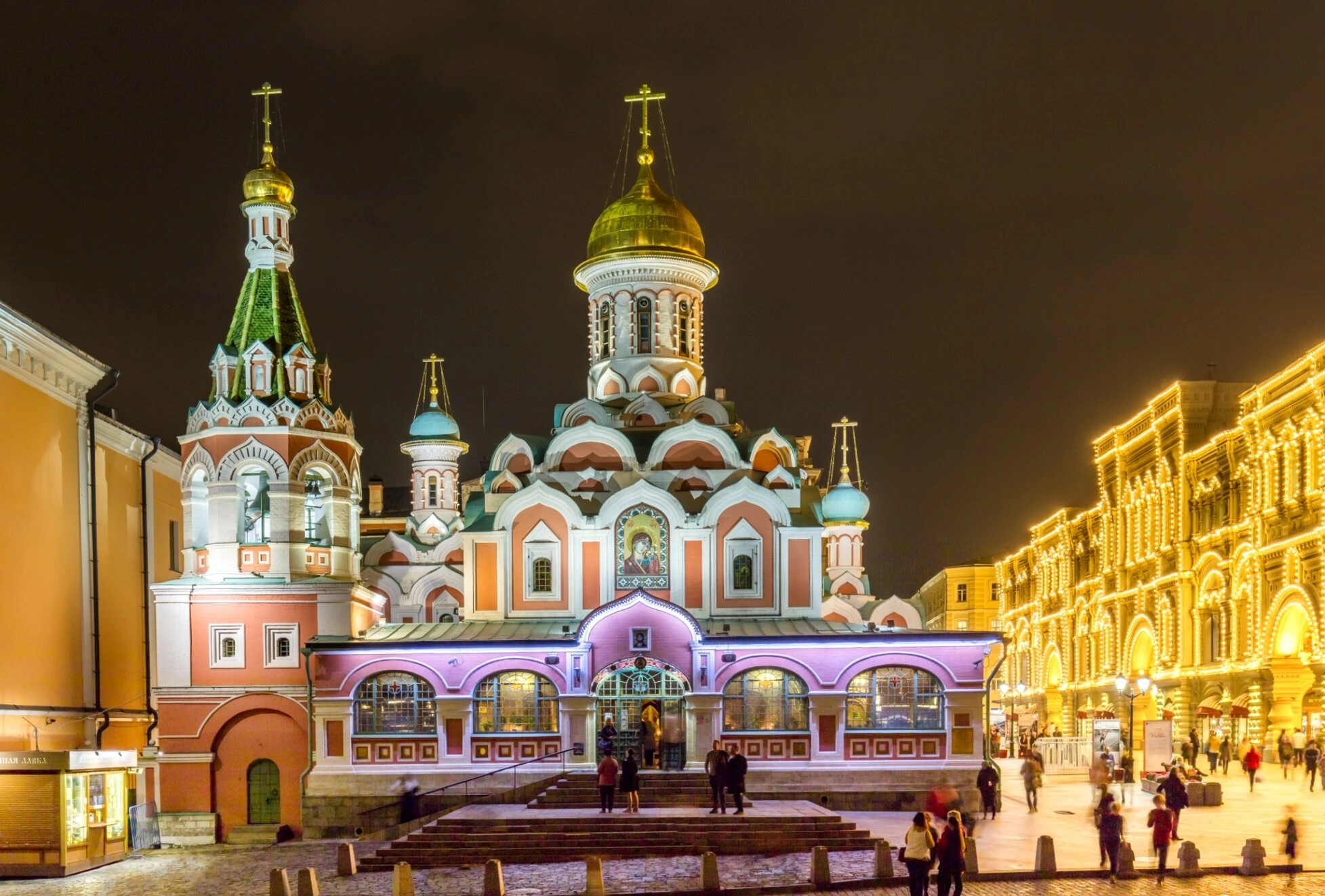 На представленной фотографии запечатлён Казанский собор, что на Красной площади в Москве, в благоговейной тишине ночного времени. Снимок являет нам образ этого богородичного храма, ярко озарённого искусственным светом, который выхватывает из темноты его нарядные стены и устремлённые к небу главы. Собор Казанской иконы Божией Матери, воздвигнутый в память об освобождении Москвы в 1612 году и вновь воссозданный на своём историческом месте в 1993 году, предстаёт во всей своей символической красоте.