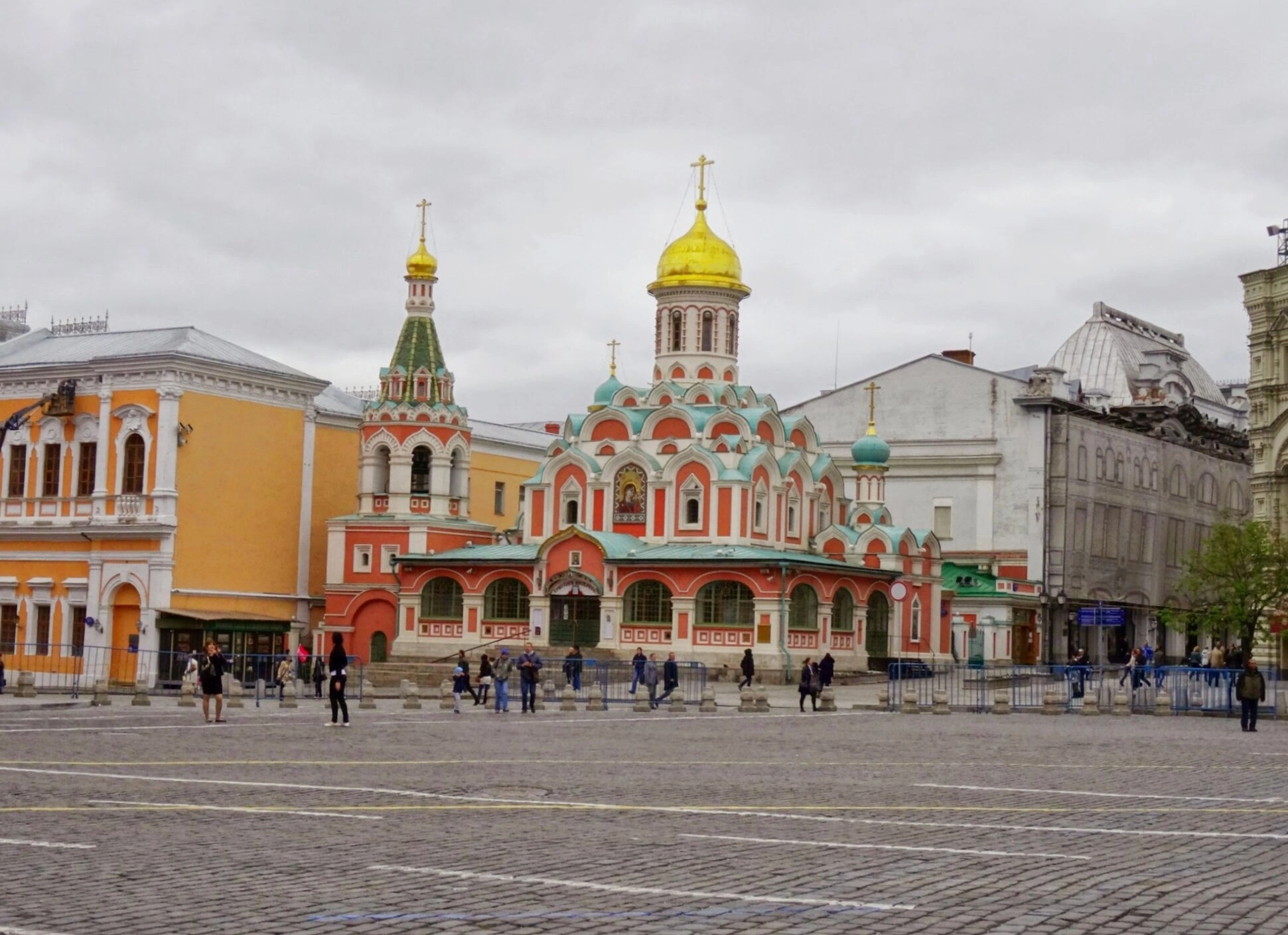 На фотографии собор изображён в своей естественной среде — на брусчатке Красной площади. В пасмурный день его яркие фасады светятся удивительным внутренним светом. На площади видны пешеходы, однако ни один из них не показан крупным планом; их фигуры служат лишь для передачи масштаба и оживлённости места, не отвлекая внимания от архитектурной доминанты.