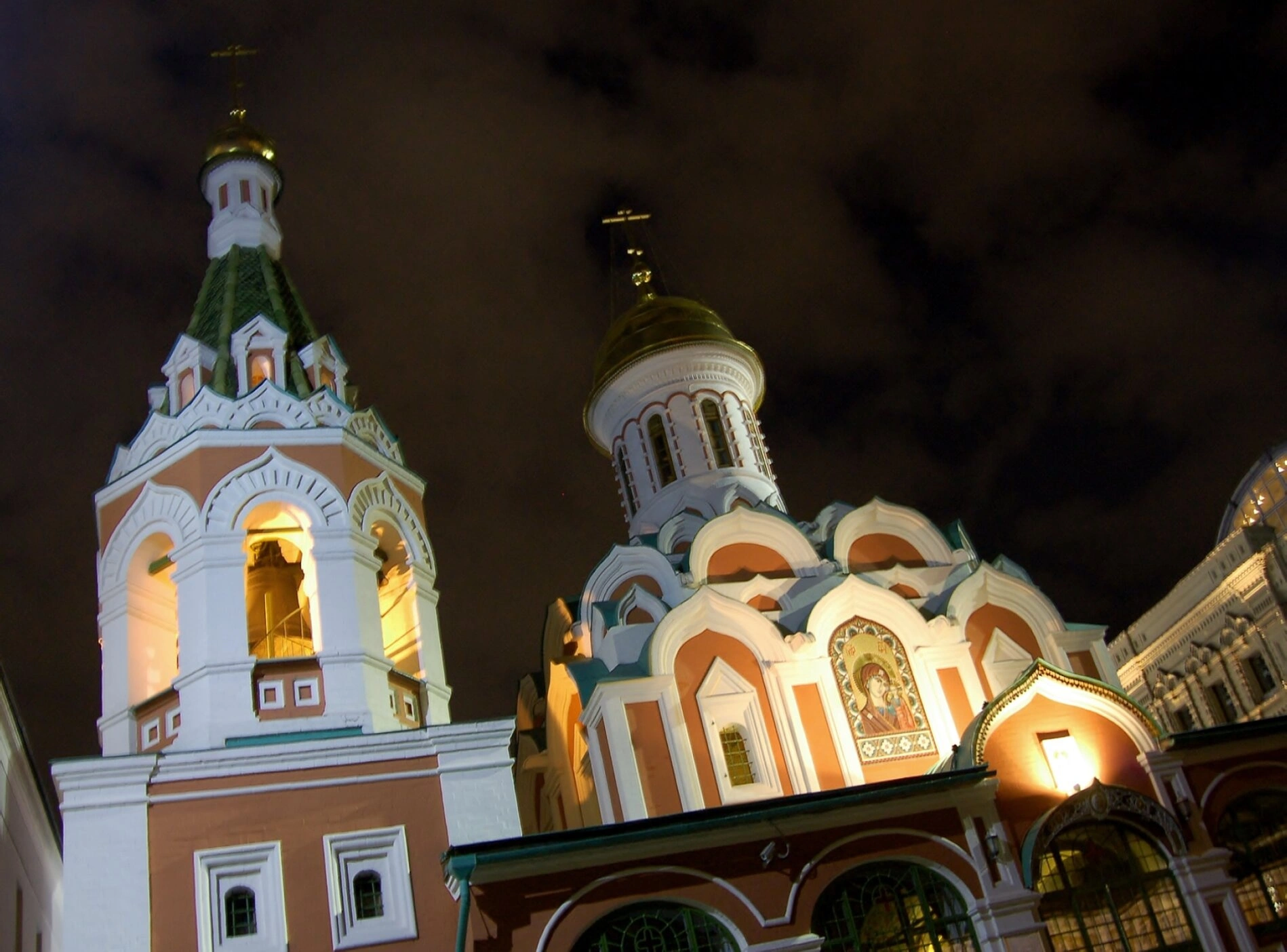 На представленной фотографии запечатлён Казанский собор, расположенный на Красной площади в Москве, в благоговейной тишине ночного времени. Искусственное освещение мягко выхватывает из темноты нарядные терракотово-красные стены, белоснежные декоративные элементы и сияющие золотом главы, создавая торжественный и созерцательный образ этого святого места. Слева возвышается шатровая колокольня, а справа — основной объём храма, увенчанный ярусами кокошников, ведущих взор к центральному куполу.