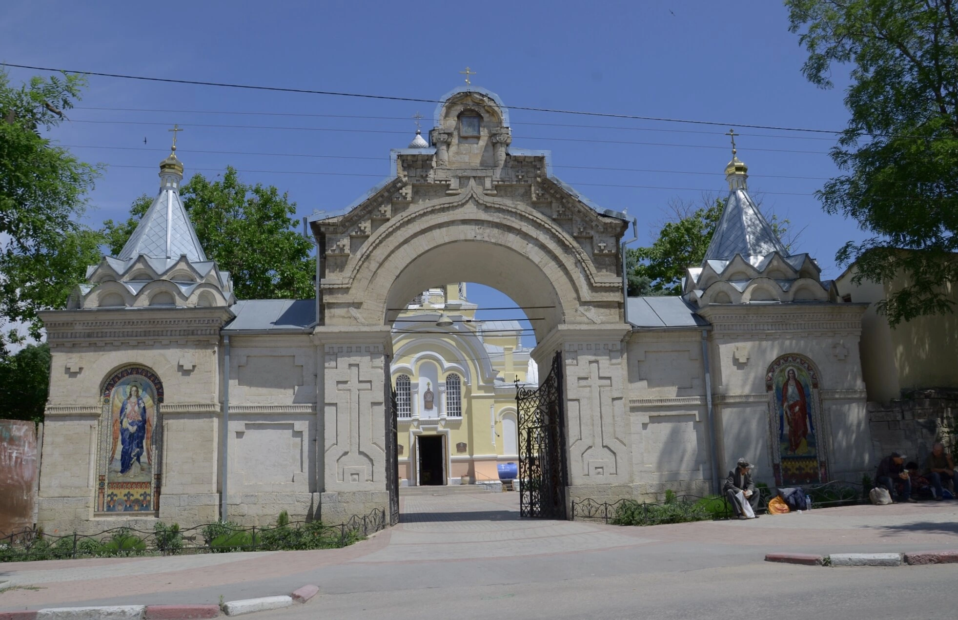 На представленной фотографии запечатлён величественный вход на территорию Свято-Казанского собора в городе Феодосия. Снимок демонстрирует монументальные арочные ворота, являющиеся главным входом в церковную ограду. Ворота украшены традиционными православными крестами и увенчаны небольшой главкой с крестом, что сразу задаёт сакральный тон всему архитектурному комплексу.