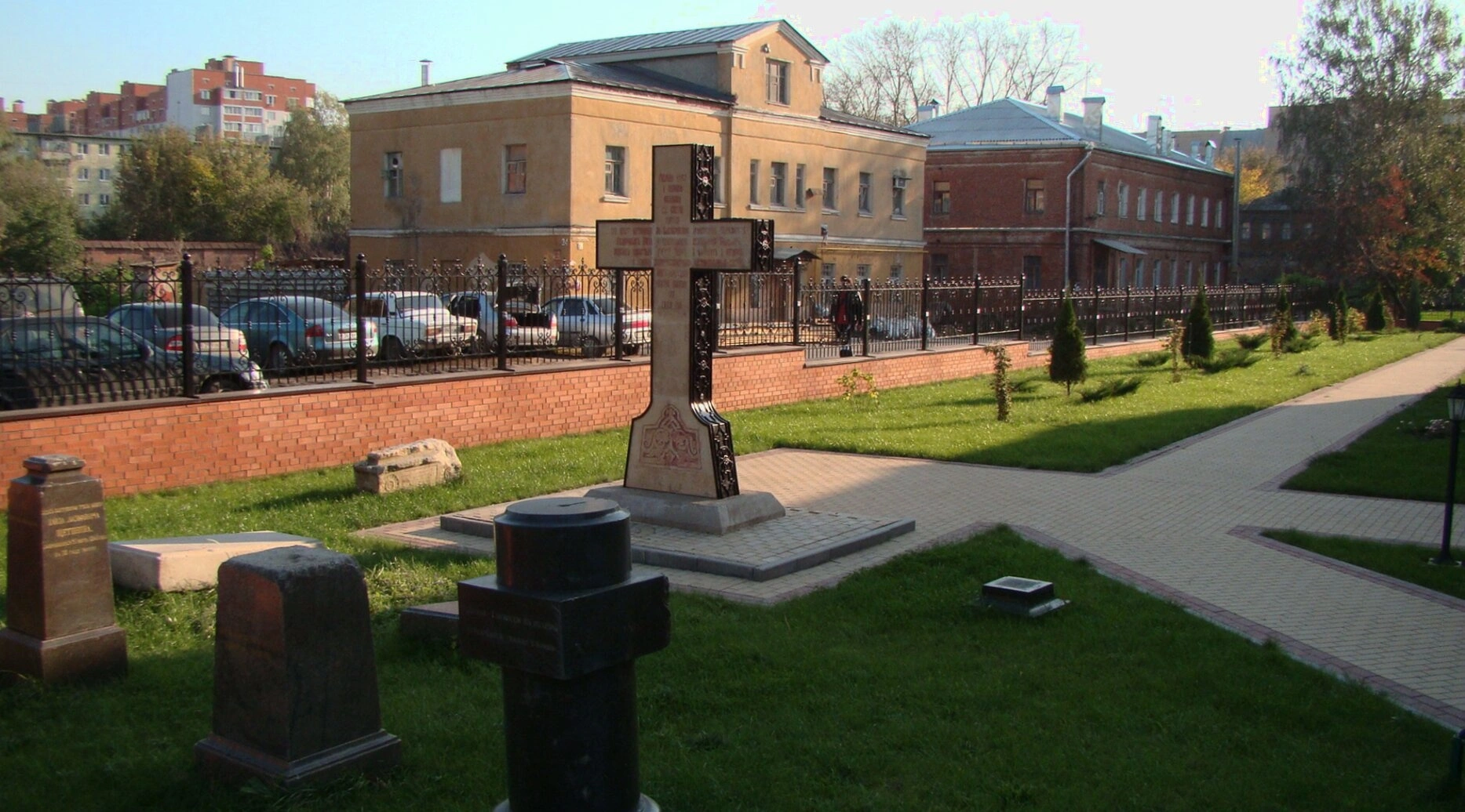 На представленной фотографии запечатлена святая земля Казанского Явленского женского монастыря в Рязани. В центре композиции возвышается величественный поклонный крест, установленный на каменном постаменте в знак памяти и молитвенного подвига всех насельниц и благотворителей обители. Вокруг креста располагаются старинные надгробия монастырского некрополя, где обрели вечный покой многие подвижницы благочестия, потрудившиеся во славу Божию на этой земле.