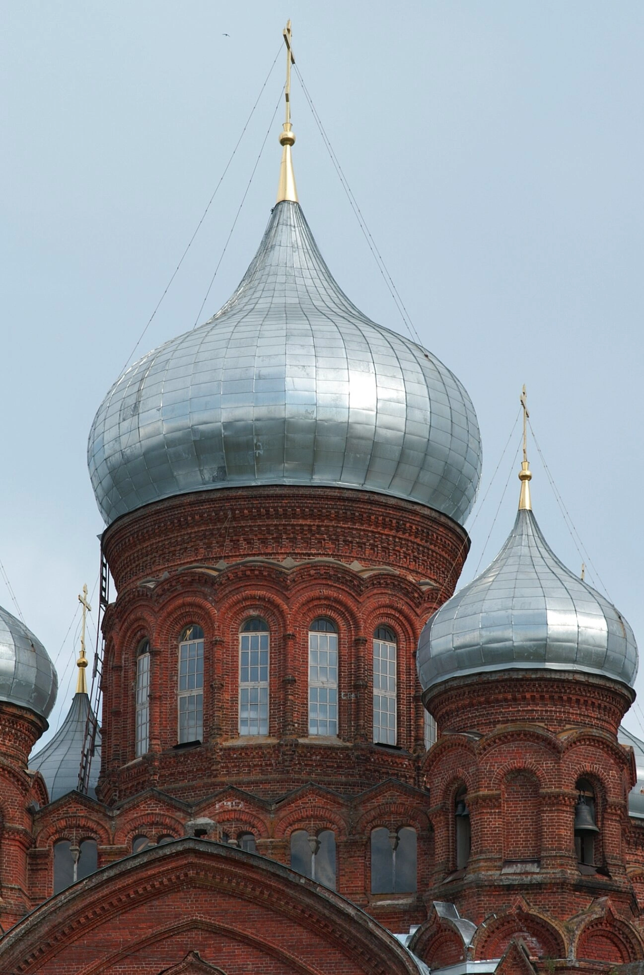 Доминируют в композиции несколько мощных куполов, покрытых светлым металлическим листом, который на солнце отливает серебристым блеском. Каждая глава увенчана златоглавым крестом, символом победы Господа нашего Иисуса Христа над смертью. Под куполами возвышаются украшенные кокошниками и арочными проёмами барабаны, а также богато декорированные кирпичной кладкой стены основного объёма храма.