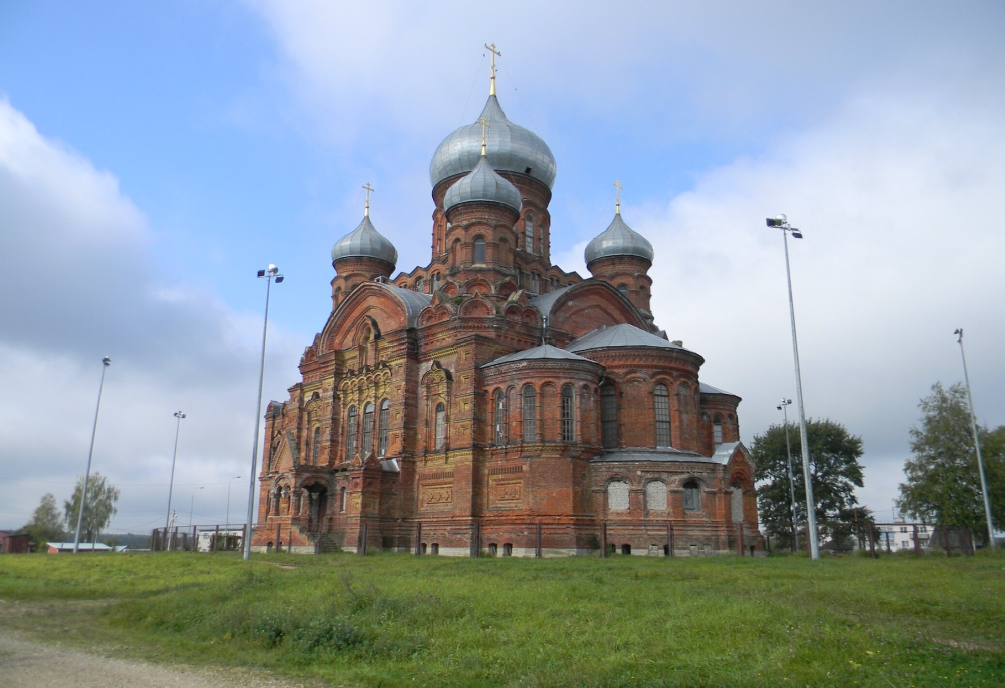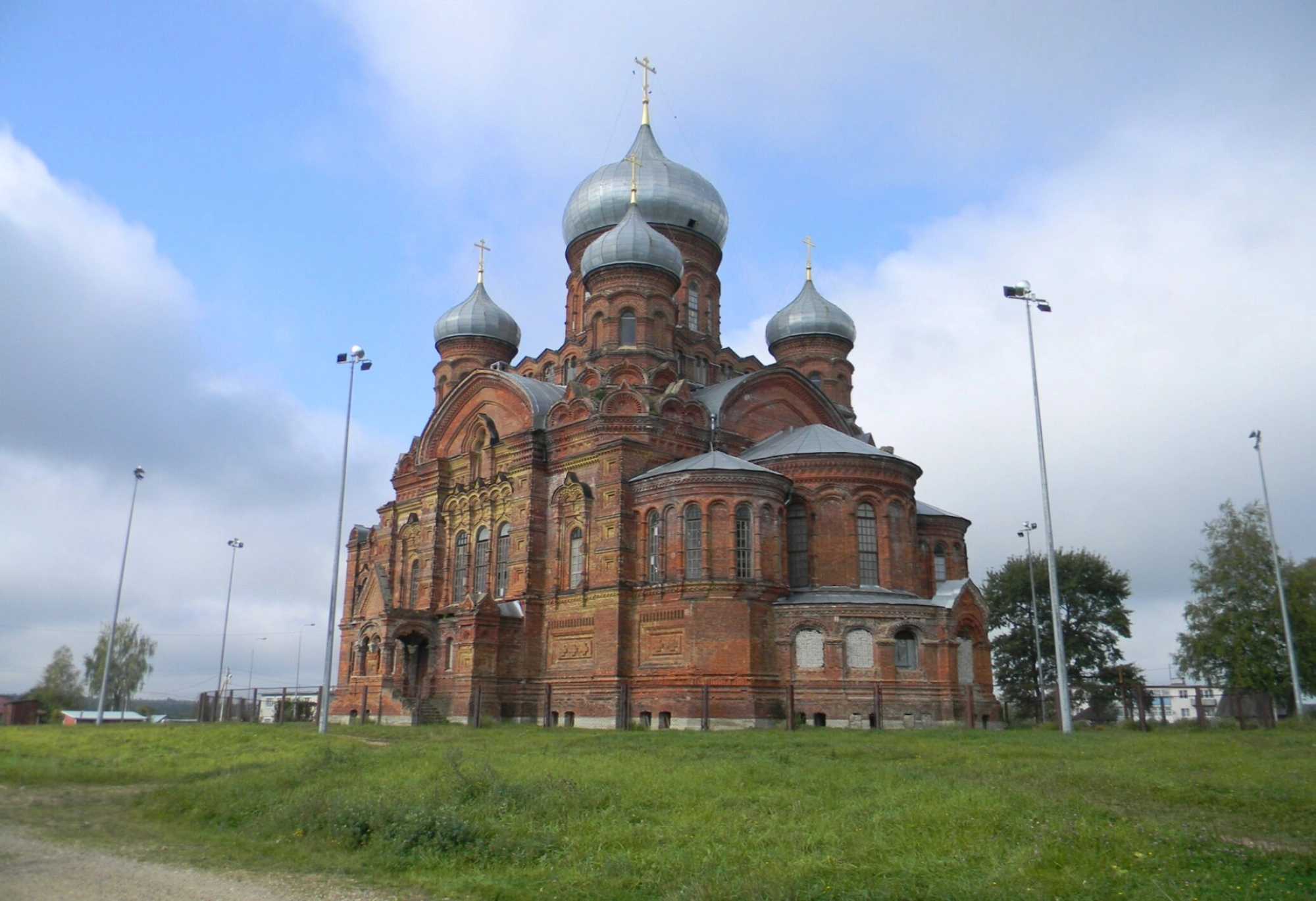 Собор, чей монументальный облик явлен на снимке, был возведен по проекту renowned зодчего Василия Косякова и освящен в 1918 году. Храм представляет собой выдающийся памятник церковной архитектуры неорусского стиля, отличающийся грандиозными размерами и гармонией форм. Его мощный кубический объем увенчан массивным пятиглавием, а фасады украшены аркатурными поясами и килевидными закомарами, что создает ощущение незыблемости и величия.