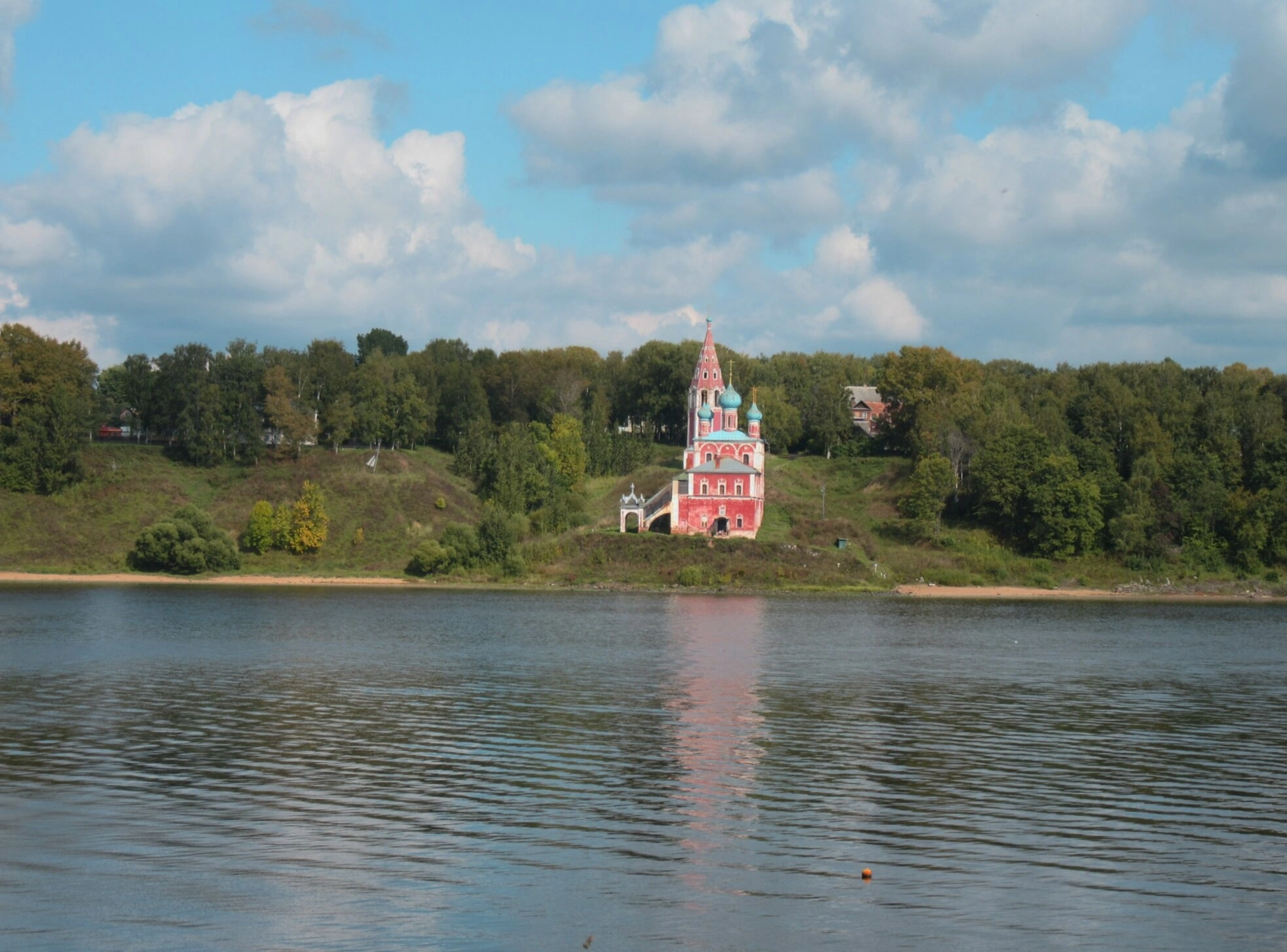 На фотографии запечатлён величественный православный храм — Церковь Казанской иконы Божией Матери и Преображения Господня, расположенная в городе Тутаеве Ярославской области. Храм живописно возвышается на крутом правом берегу реки Волги, являясь архитектурной доминантой этой местности и прекрасным образцом русского церковного зодчества второй половины XVIII века.