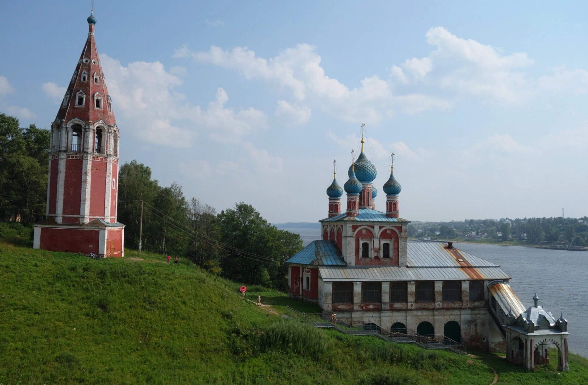 На фотографии запечатлена Казанско-Преображенская церковь, являющаяся архитектурной доминантой романовской стороны города Тутаева Ярославской области. Этот православный храм, памятник церковной архитектуры XVIII века, живописно расположен на крутом левом берегу Волги и играет важную роль в формировании прибрежного ансамбля.
