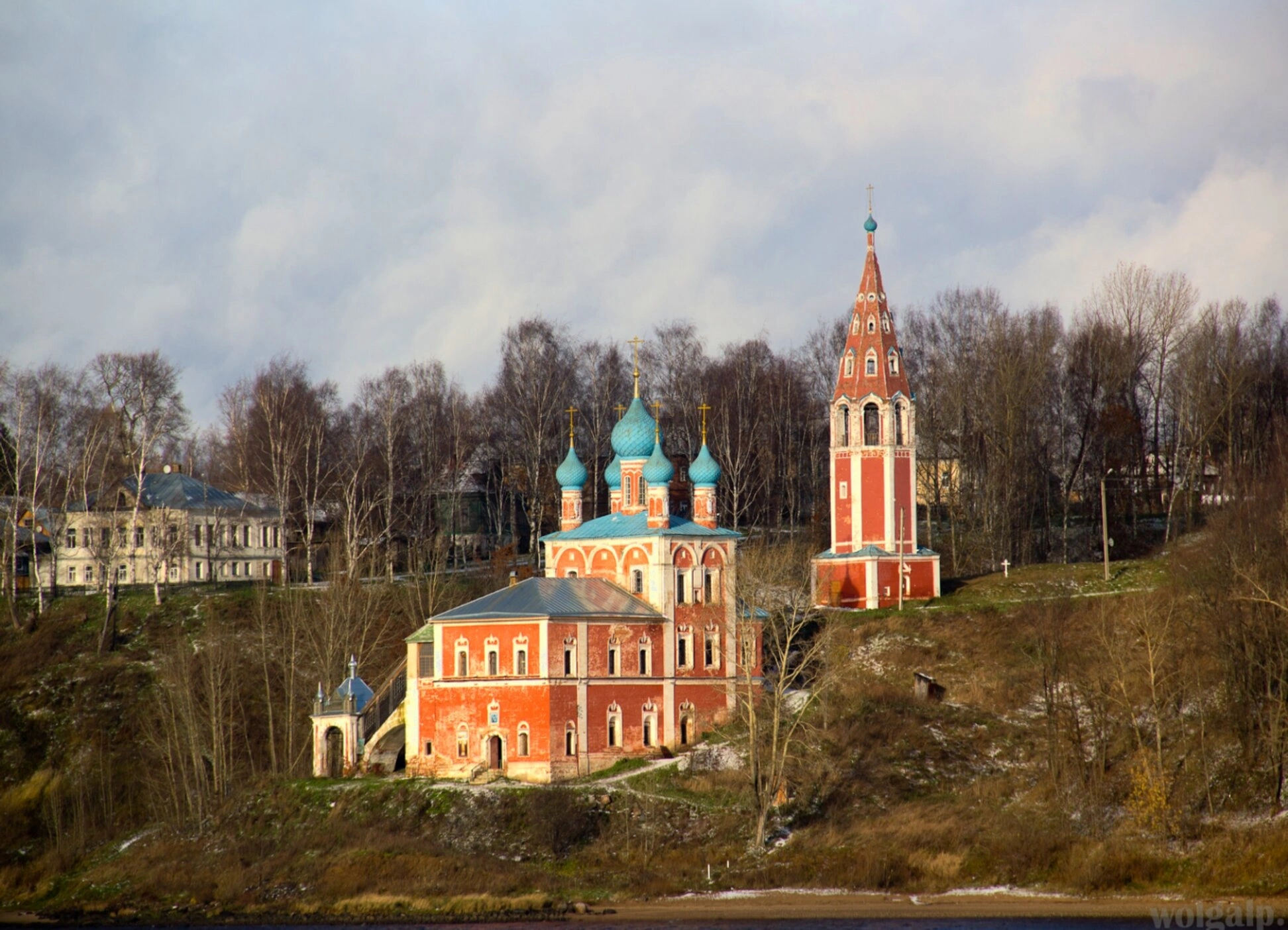 На представленной фотографии запечатлён величественный ансамбль Казанско-Преображенской церкви, расположенной в городе Тутаеве Ярославской области. Этот храмовый комплекс, живописно возвышающийся на крутом берегу реки Волги, является одной из архитектурных доминант Романовской стороны города и выдающимся памятником русского церковного зодчества.