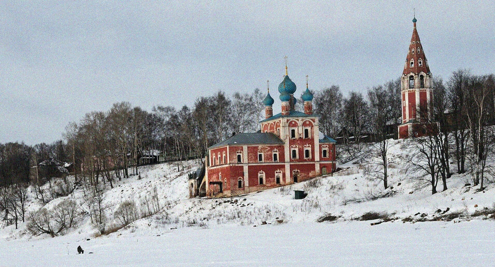 На фотографии запечатлена Казанско-Преображенская церковь — выдающийся православный храм и архитектурный памятник XVIII века, расположенный на крутом левом берегу Волги в городе Тутаеве Ярославской области. Этот храмовый комплекс, возведённый в 1758 году, является визитной карточкой Романовской стороны города и играет доминирующую роль в формировании его живописного силуэта.