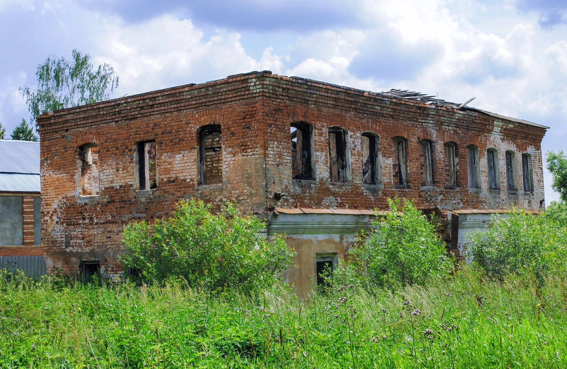 На представленной фотографии запечатлён келейный корпус Церкви Преображения Господня, расположенный в селе Колычёво Егорьевского района Московской области. Здание находится в severely разрушенном состоянии, свидетельствующем о многолетнем запустении святого места.