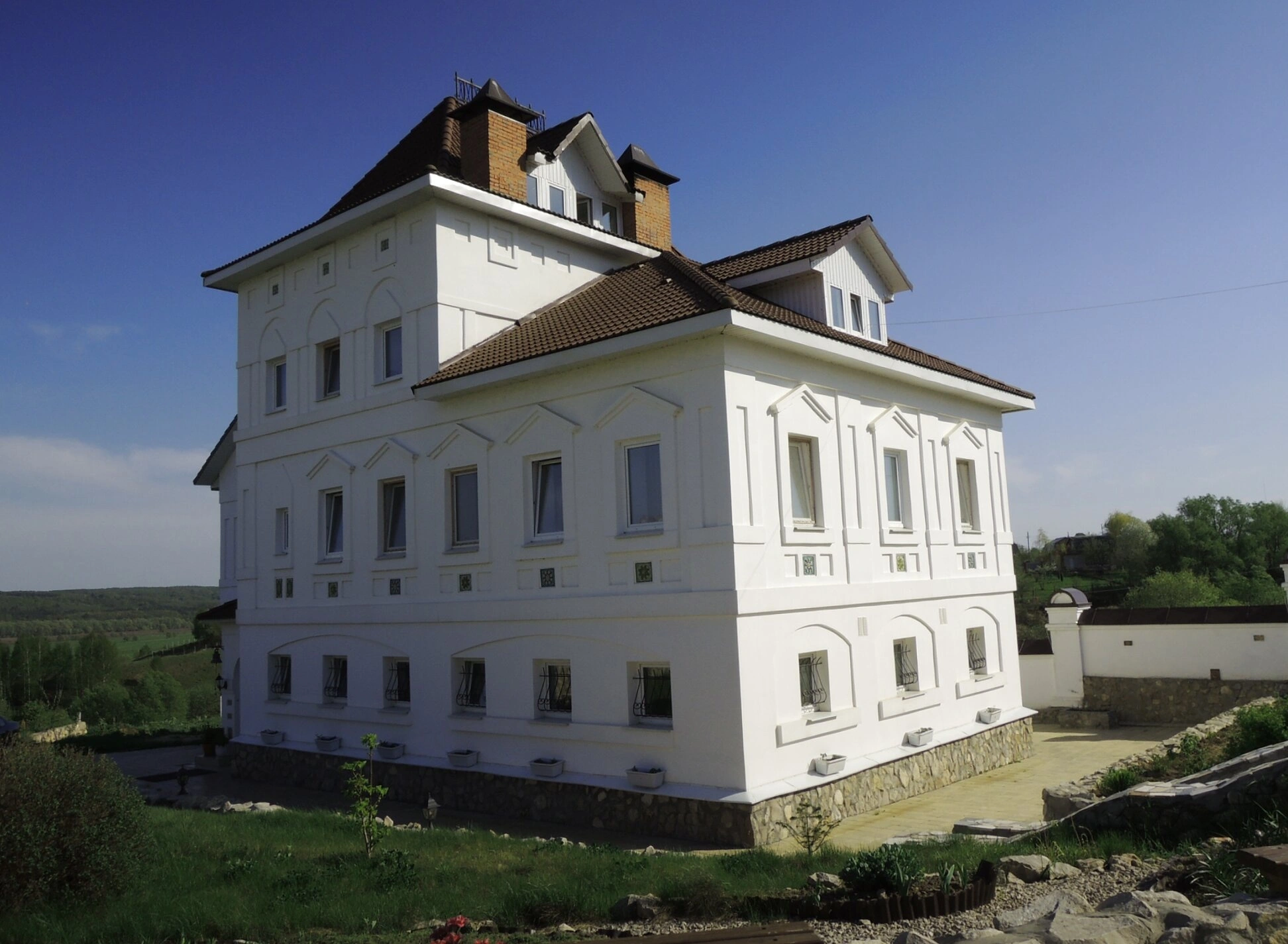 На представленной фотографии запечатлён один из келейных корпусов Спасо-Воротынского женского монастыря, находящегося в Калужской области близ знаменитой реки Угры. Здание, исполненное в строгих и благолепных формах классического стиля, служит жилищем для насельниц обители. Его белоснежные оштукатуренные стены и высокая крыша, покрытая тёмной черепицей, являют собой образец традиционного монастырского строительства, направленного на создание атмосферы молитвенного уединения и сосредоточенности.