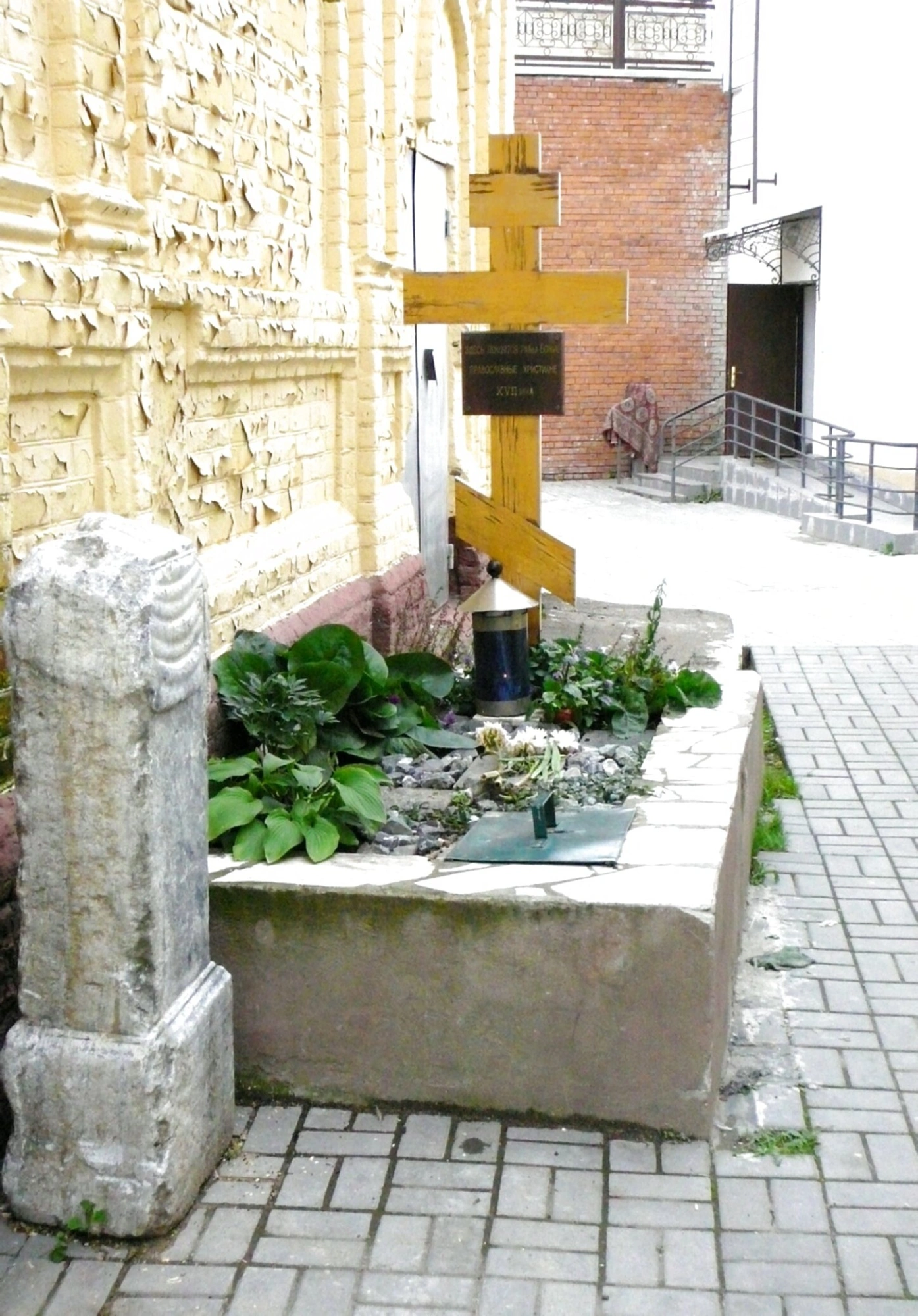 Вероятно, данное захоронение или памятный знак принадлежит человеку, чьё тело покоится в ином месте, но который внёс значительный вклад в жизнь православной общины или самого собора. Аккуратно обустроенная вокруг кенотафа небольшая клумба с цветами и декоративными камнями символизирует заботу и молитвенную память живых об упокоении души.