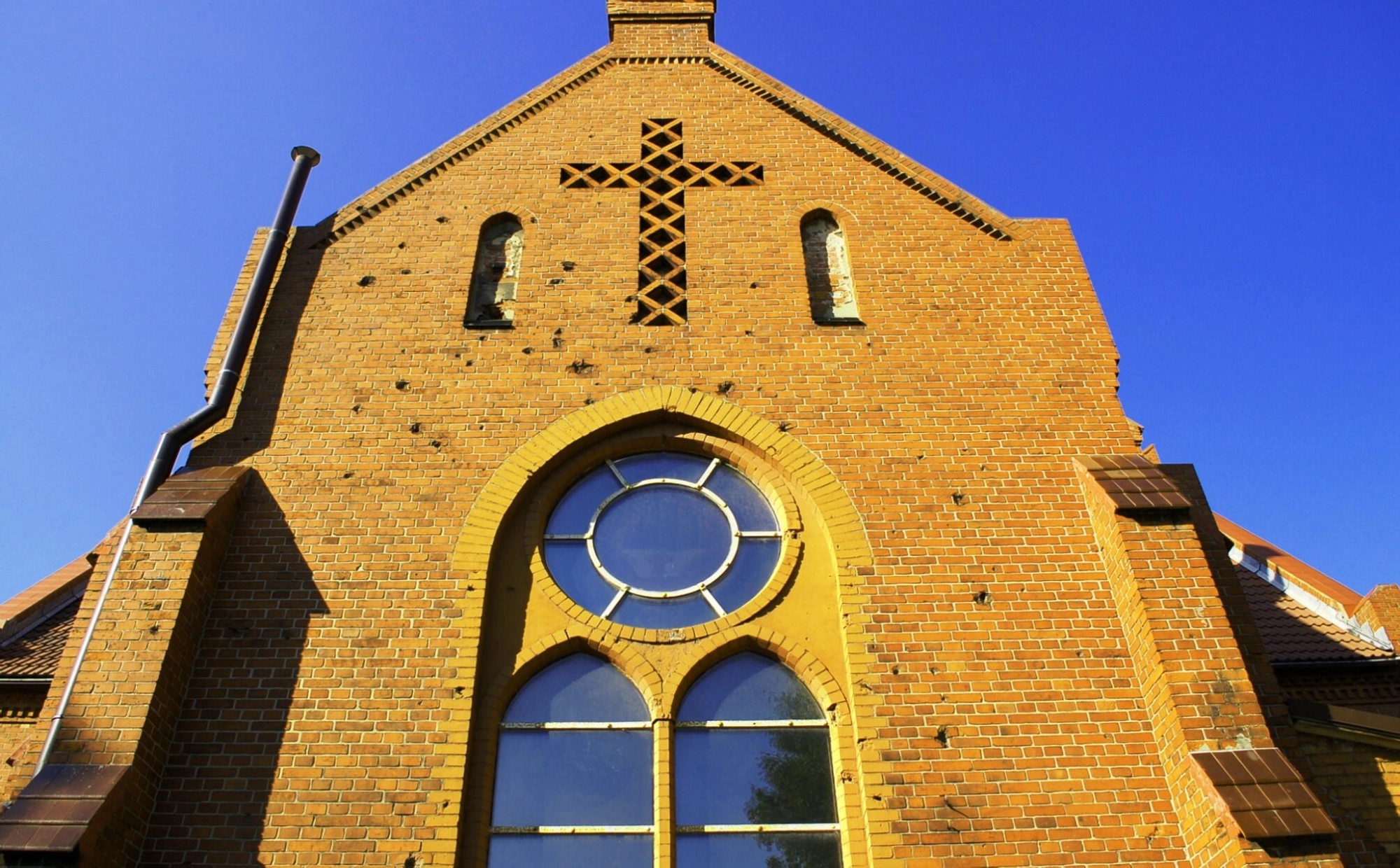 Главным материалом строительства послужил полнотелый красный керамический кирпич, придающий сооружению монументальность и строгость. На фотографии хорошо читаются характерные элементы готической архитектуры: высокие стрельчатые окна и круглое окно-роза, через которые в помещение храма проникает свет. В центре фронтона, над окнами, из кирпича более тёмного оттенка искусно выложен крест — традиционный символ христианской веры. Кирпичная кладка демонстрирует высокое мастерство строителей того времени, использовавших как обычный, так и специальный фасонный кирпич для создания декоративных деталей.