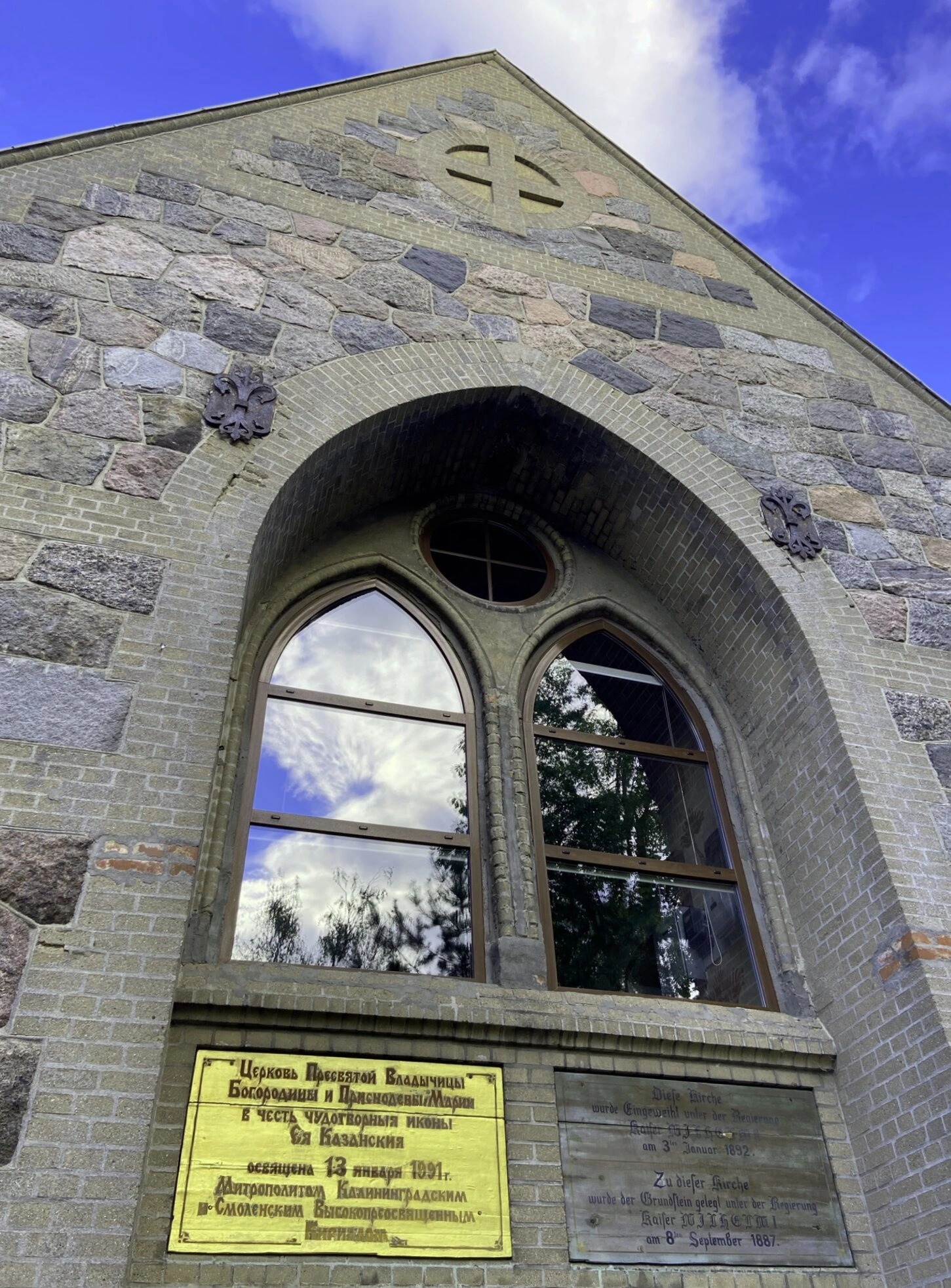 13 января 1991 года митрополит Смоленский и Калининградский Кирилл (впоследствии Патриарх Московский и всея Руси) освятил храм в честь Казанской иконы Божией Матери. Об этом событии напоминает жёлтая мемориальная доска справа от окна, на которой приведён соответствующий текст на русском языке. Выше расположена металлическая доска с немецкой надписью, где частично видна дата «8 September 188…» — день закладки первоначальной кирхи.