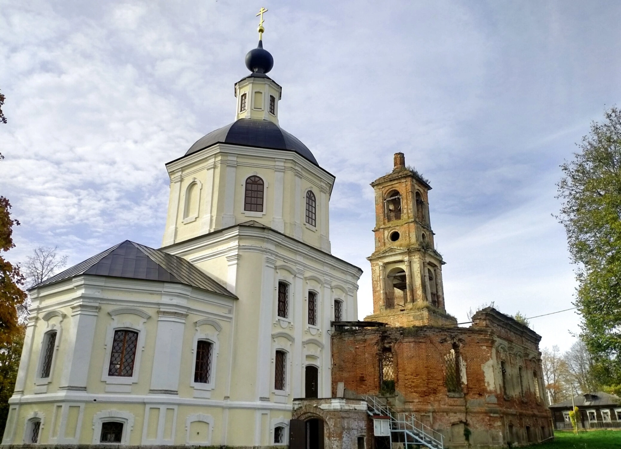 Храм расположен в спокойном сельском пейзаже. На переднем плане справа видна грунтовая дорога, переходящая в асфальтированное покрытие. Слева от храма находится зелёная автобусная остановка, рядом с которой установлен дорожный знак, обозначающий место для общественного транспорта. Чёрно-белая дорожная разметка отделяет проезжую часть. Окружение храма составляет скромная русская природа: вокруг растут деревья и кустарники, а за церковью просматривается стена из старого кирпича, возможно, остаток ограды или иной хозяйственной постройки. Небо в момент съёмки было частично покрыто облаками, сквозь которые проглядывают участки лазурной голубизны, создавая торжественный и светлый фон для церковного строения.