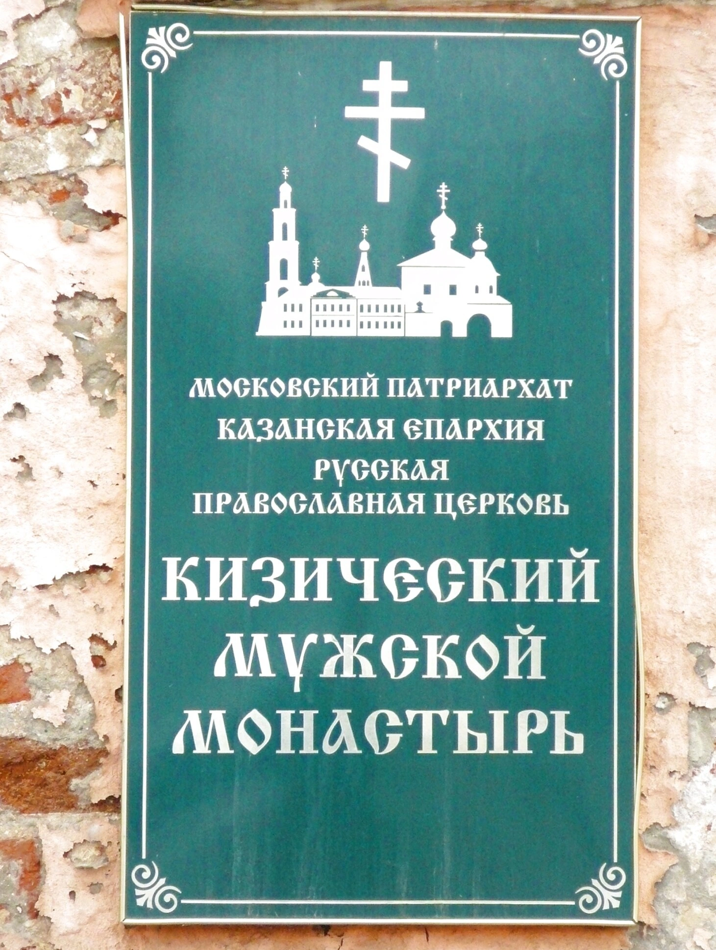 На представленной фотографии запечатлена информационная табличка, установленная на территории Кизического Введенского мужского монастыря в городе Казани. Данная табличка содержит официальное название обители и свидетельствует о её канонической принадлежности к Казанской епархии Русской Православной Церкви Московского Патриархата.