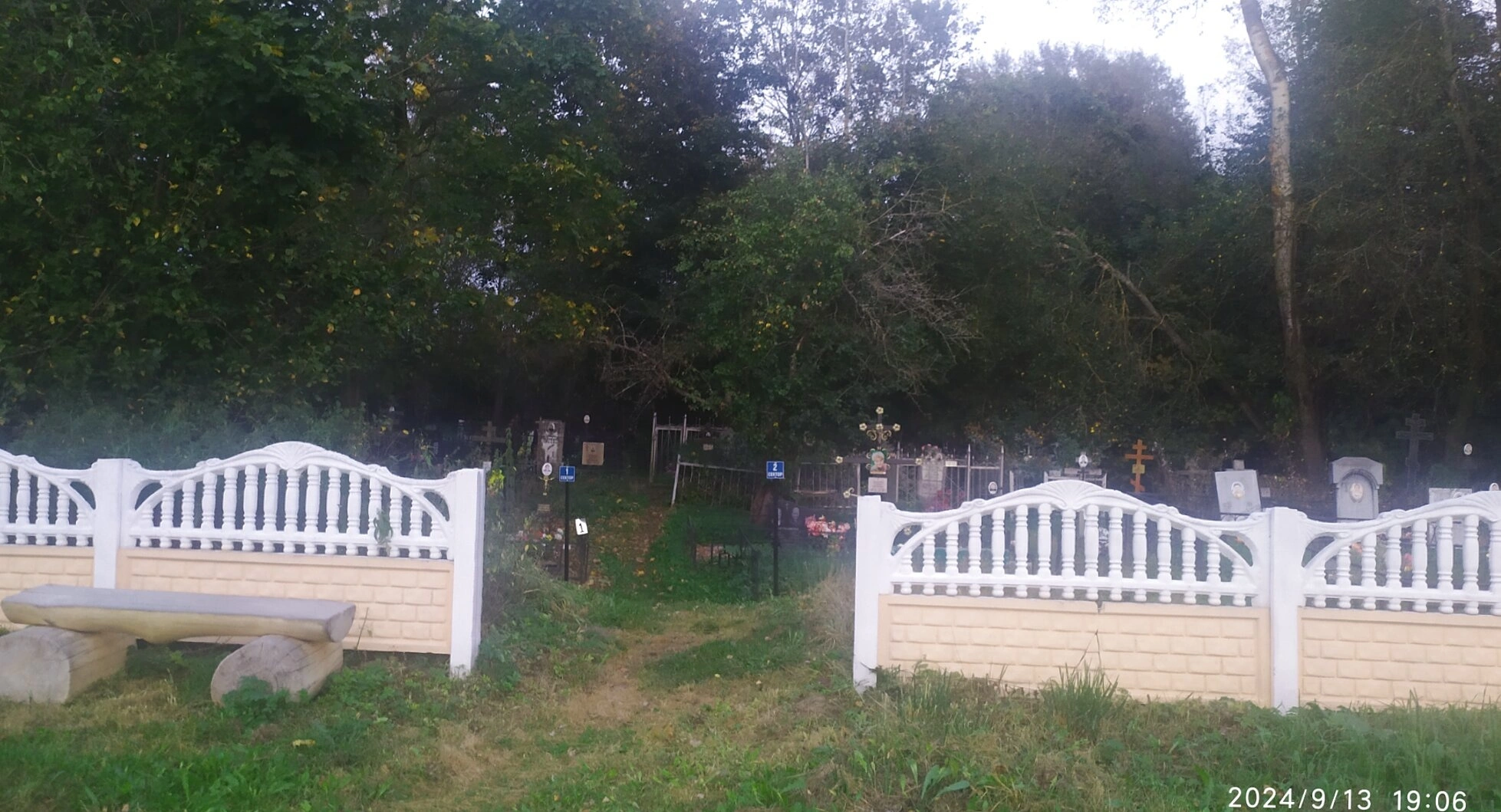 За оградой простирается ухоженная территория кладбища с многочисленными православными крестами и надгробиями, частично скрытыми под сенью деревьев. Особенностью данного погоста является его расположение в окружении густого леса, где гармонично сочетаются хвойные и лиственные породы деревьев, создавая естественную защиту от ветров и придавая месту особый покой.