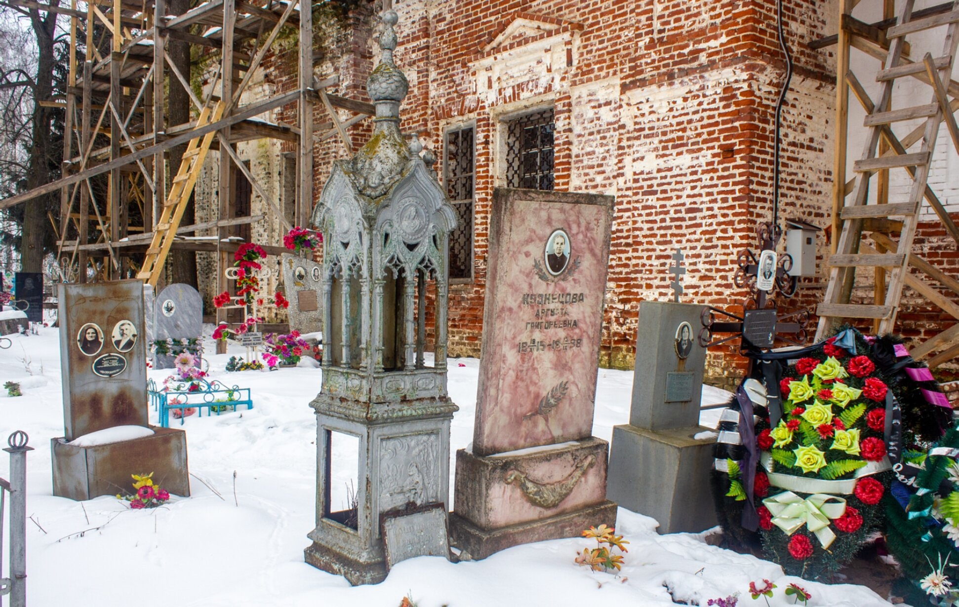 На представленной фотографии запечатлено церковное кладбище на территории Спасо-Преображенского храма в селе Сухаренки Городецкого района Нижегородской области. Справа от захоронений видна часть кирпичной стены самой церкви, которая в момент съёмки находилась на этапе реставрационных работ, о чём свидетельствуют установленные строительные леса и деревянные лестницы.