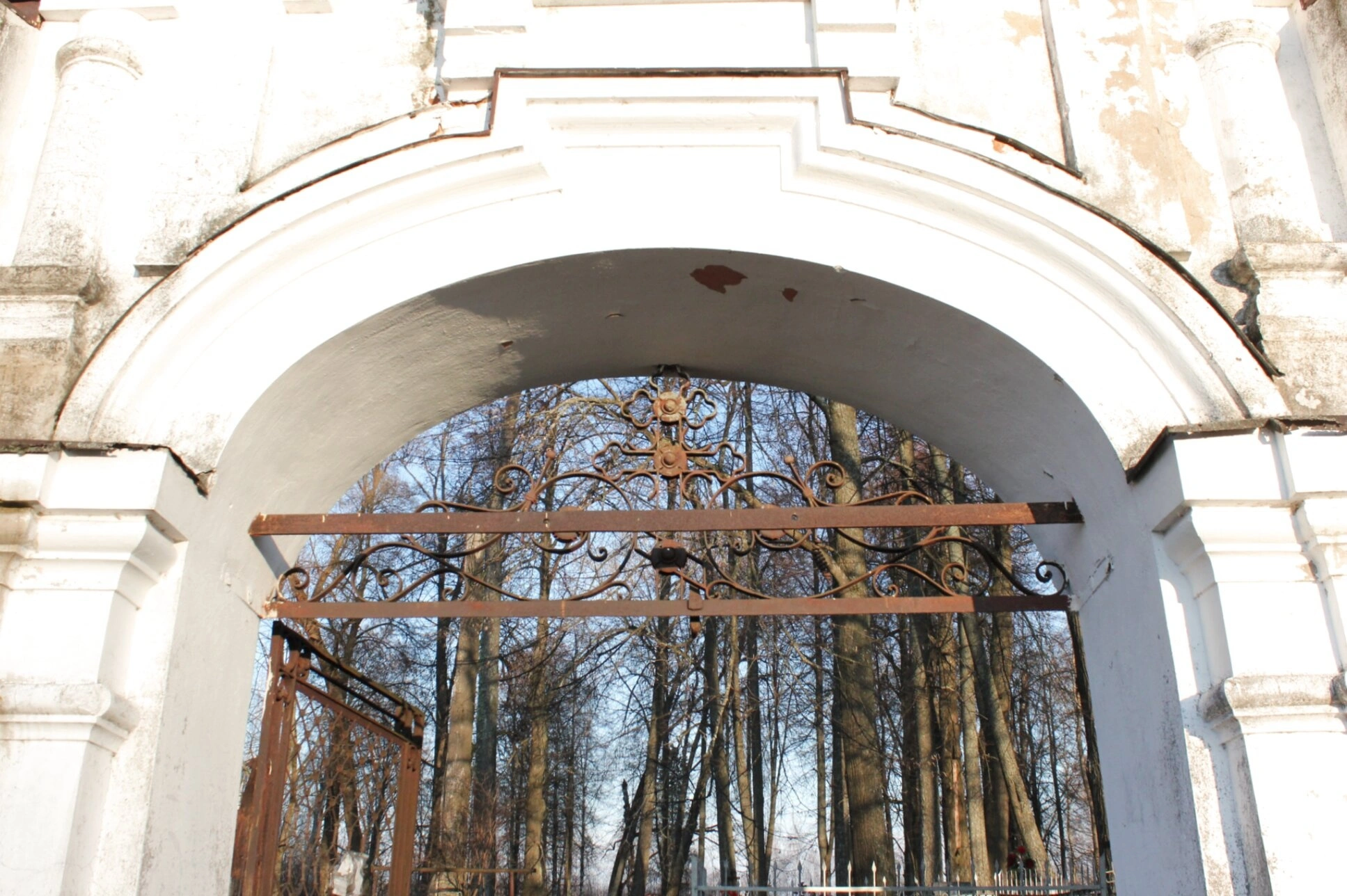 Величественные арочные ворота, выполненные в традициях барокко, служат входом на территорию храмового комплекса. Кованые металлические створки демонстрируют высокое мастерство русских кузнецов и создают торжественный переход к священному пространству церковного кладбища. Архитектурные элементы ворот отражают духовную символику, напоминая верующим о вратах Царствия Небесного.