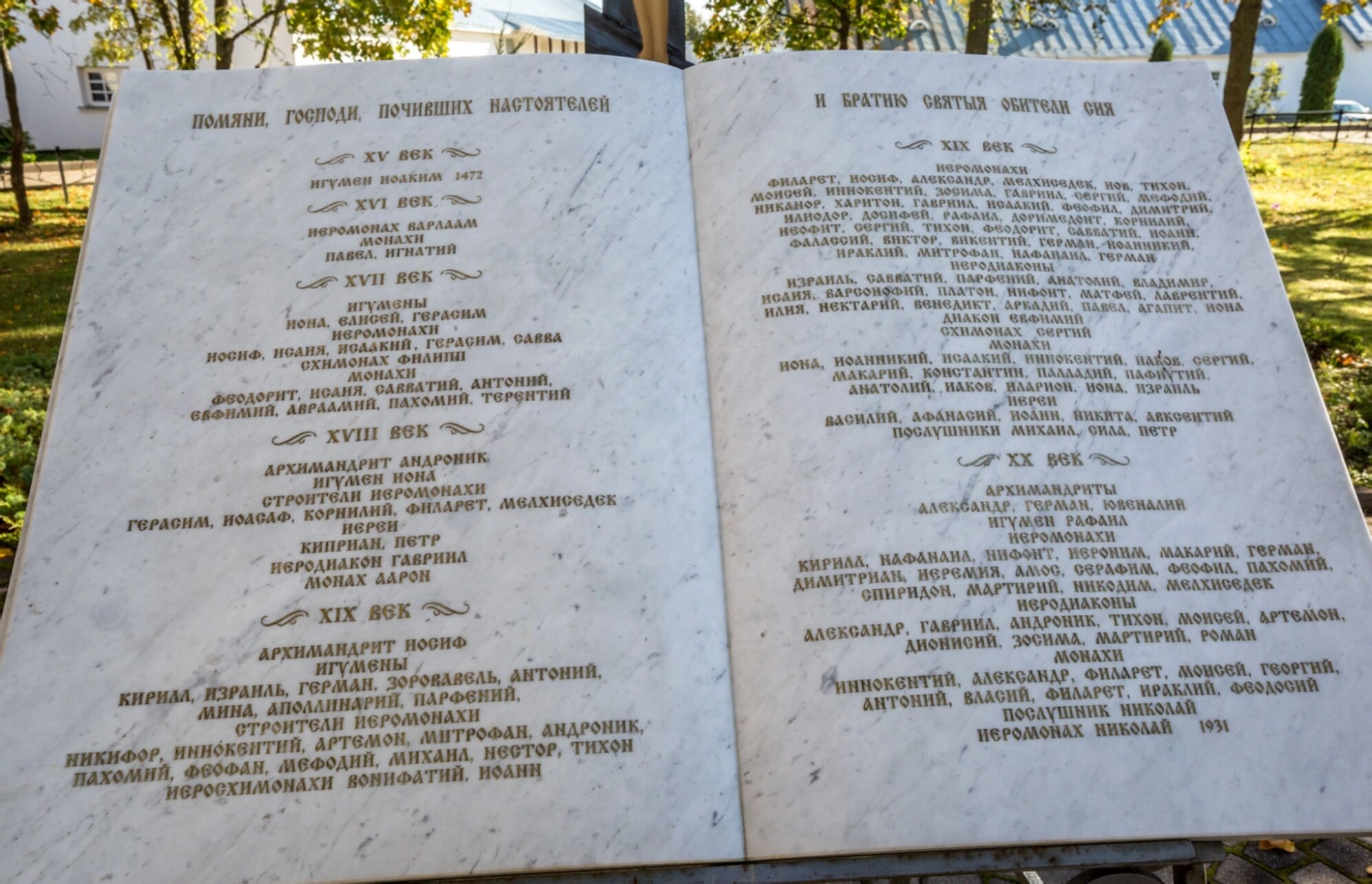 На страницах этой вечной книги скорбными, но благодарными буквами высечены имена и звания почивших настоятелей, игуменов, архимандритов, иеромонахов, монахов, послушников и иных служителей святой обители, чей молитвенный труд и подвиги созидали монастырь на протяжении его многовековой истории, начиная с XV столетия и заканчивая веком XX.