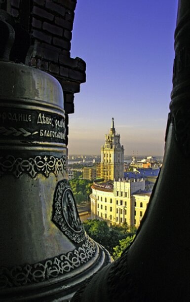 Колокол, являющийся центральным объектом снимка, служит для созыва верующих на молитву и возвещения важнейших моментов богослужения. Его мощный голос разносится над городом, освящая окрестности и напоминая о вечных ценностях. На заднем плане фотографии, в лёгкой дымке, просматривается современный городской пейзаж Воронежа, что создаёт символическое единство истории и современности, земного града и устремлённости к горнему.